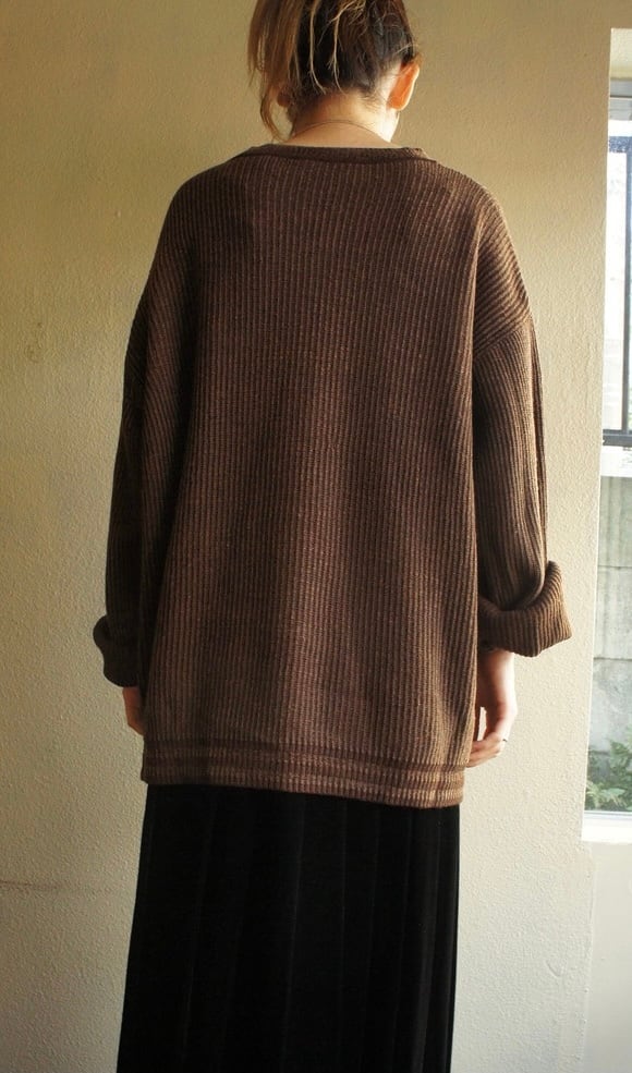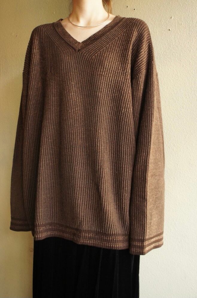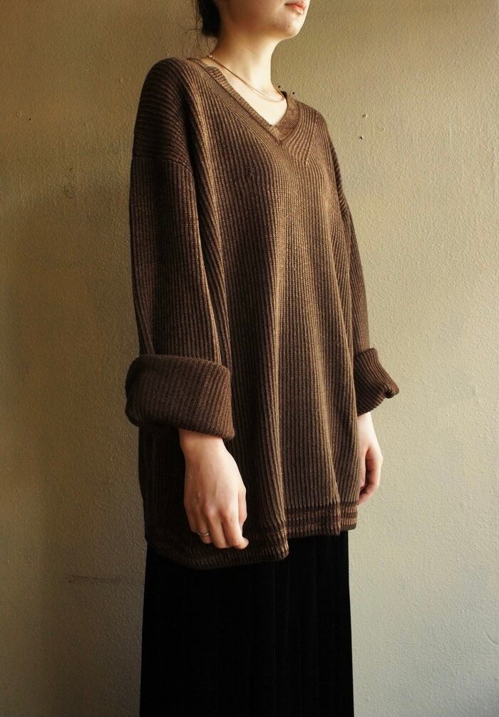 やや光沢のある生地が立体的で、ゆるいvネック、編み方がシンプルながらも洗練された一枚です☆