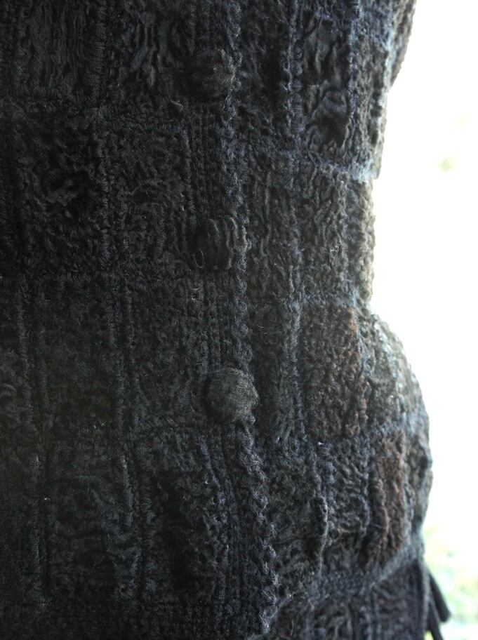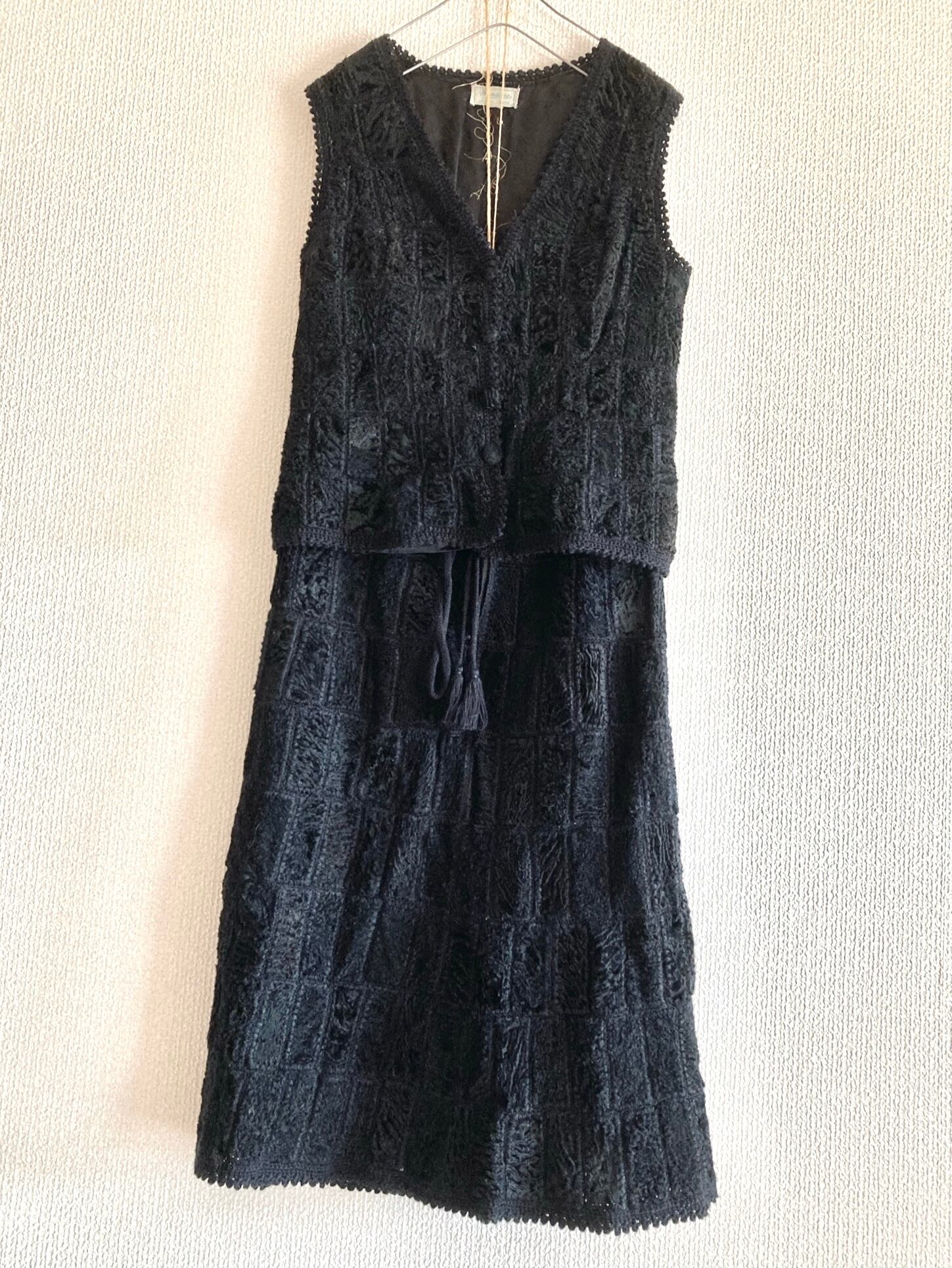 ベストの襟や縁のオヤレースのような編みと、同糸の編みボタン、スカートのタッセル紐、、とても凝った一品。。