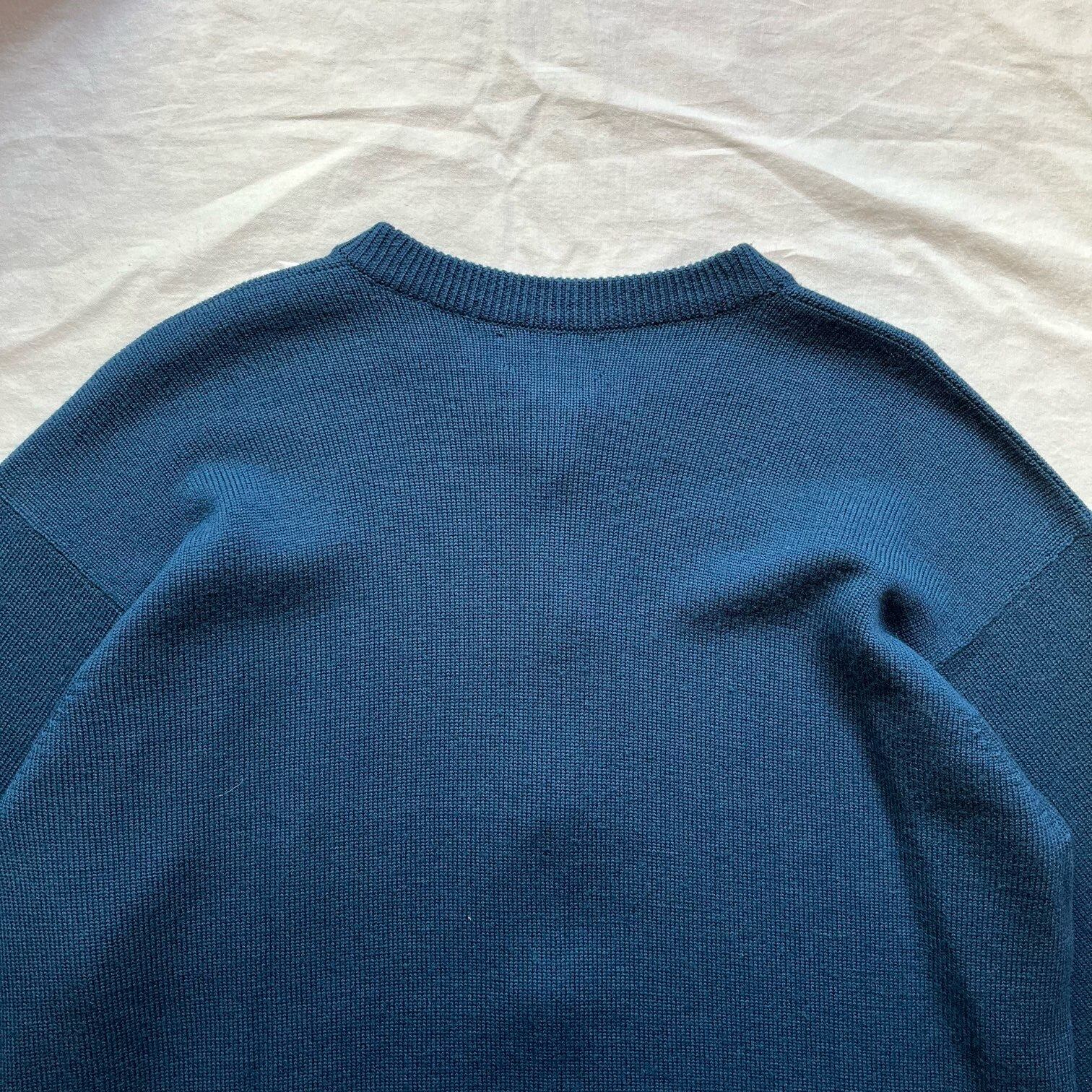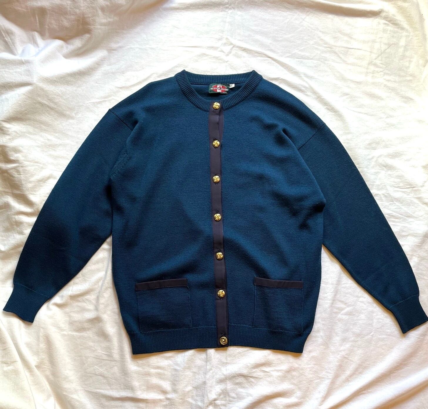 深いブルーグリーンのニット地にゴールドの編みボタンが映えるスコットランド製ニットカーデ!