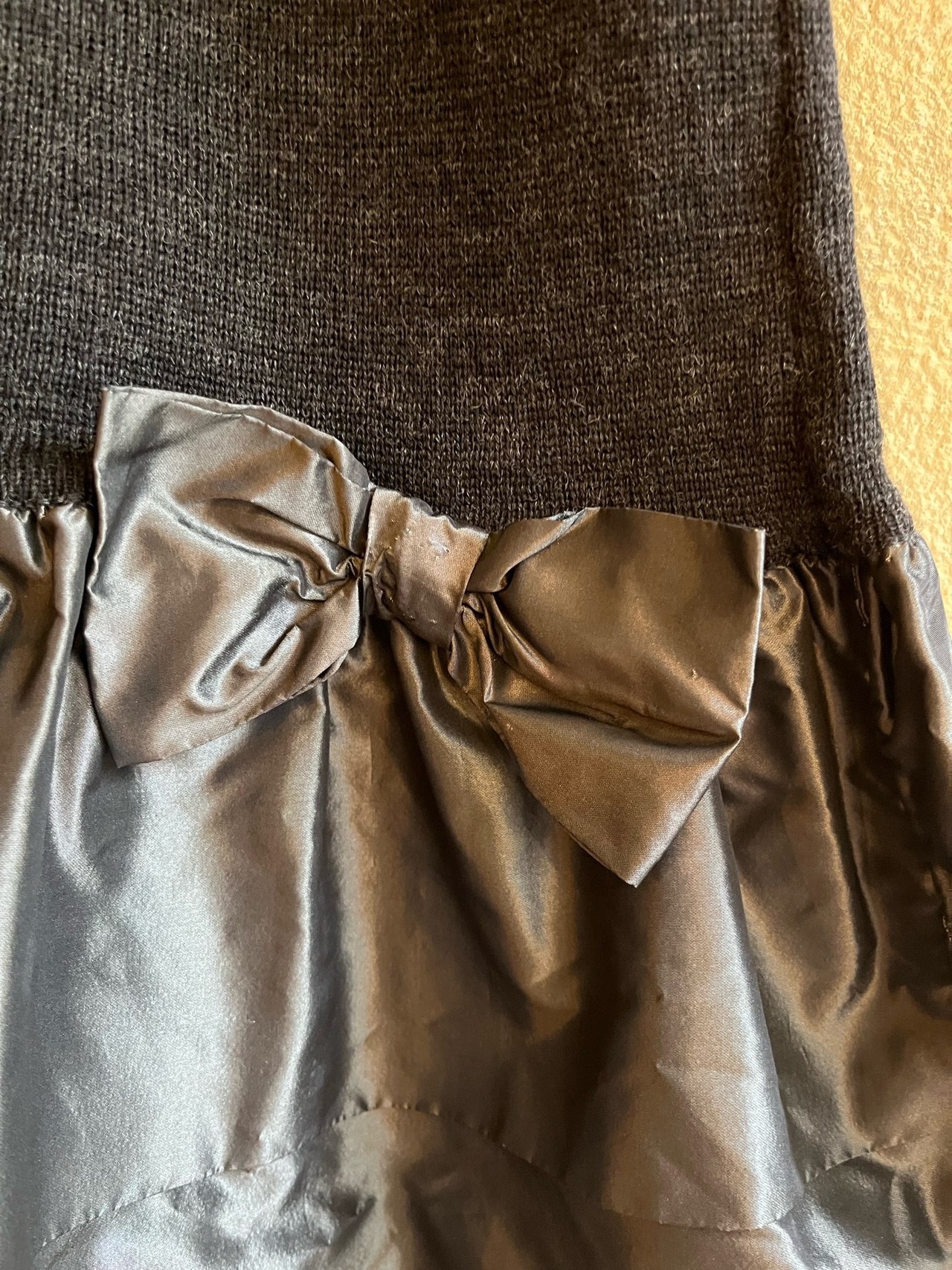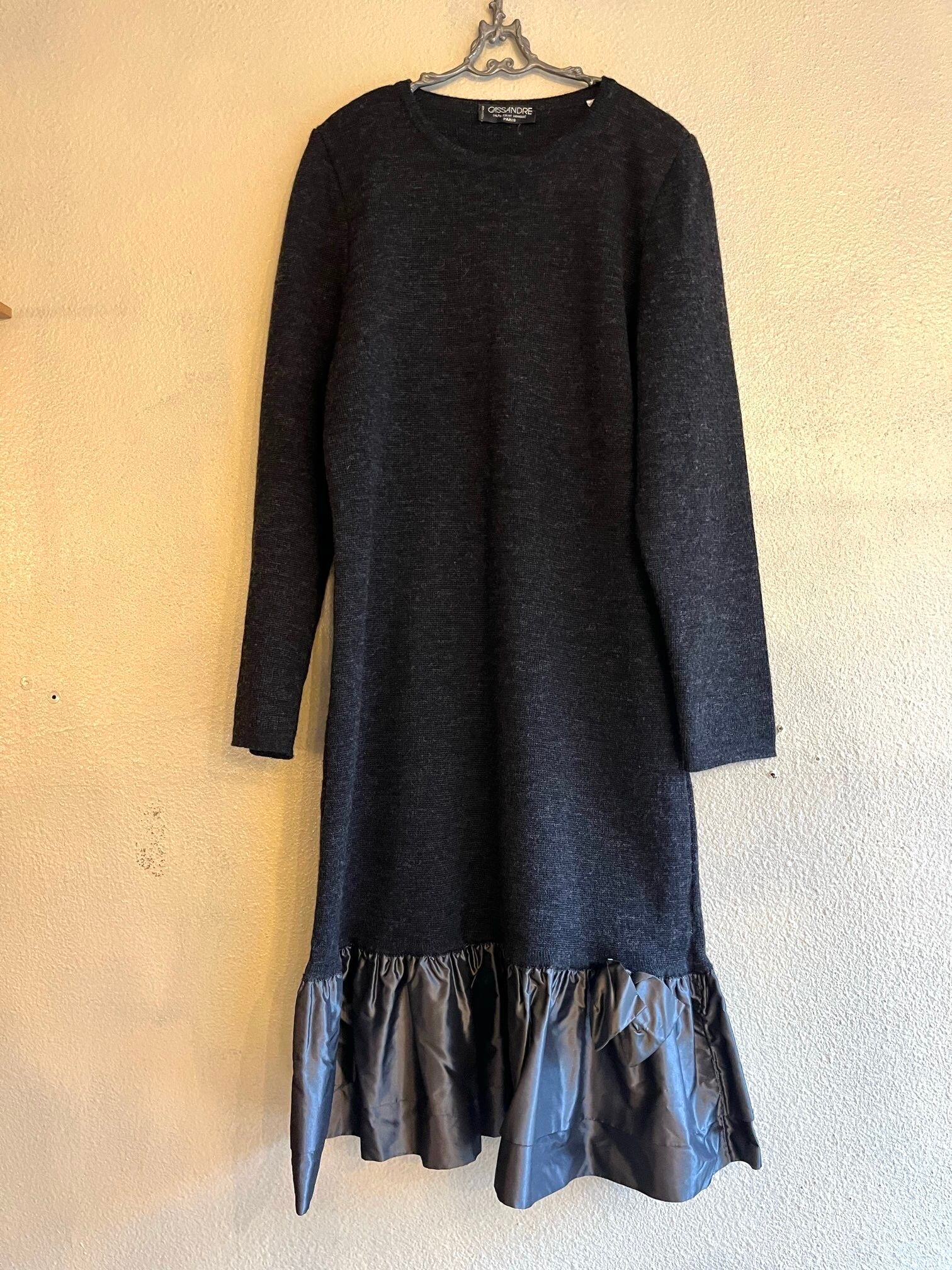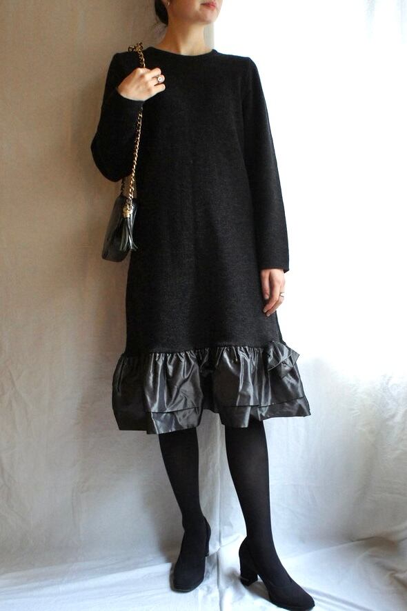 シンプルなDark Greyのウール地にLight Greyのフリルサテンがポイントに効いたニットワンピ!