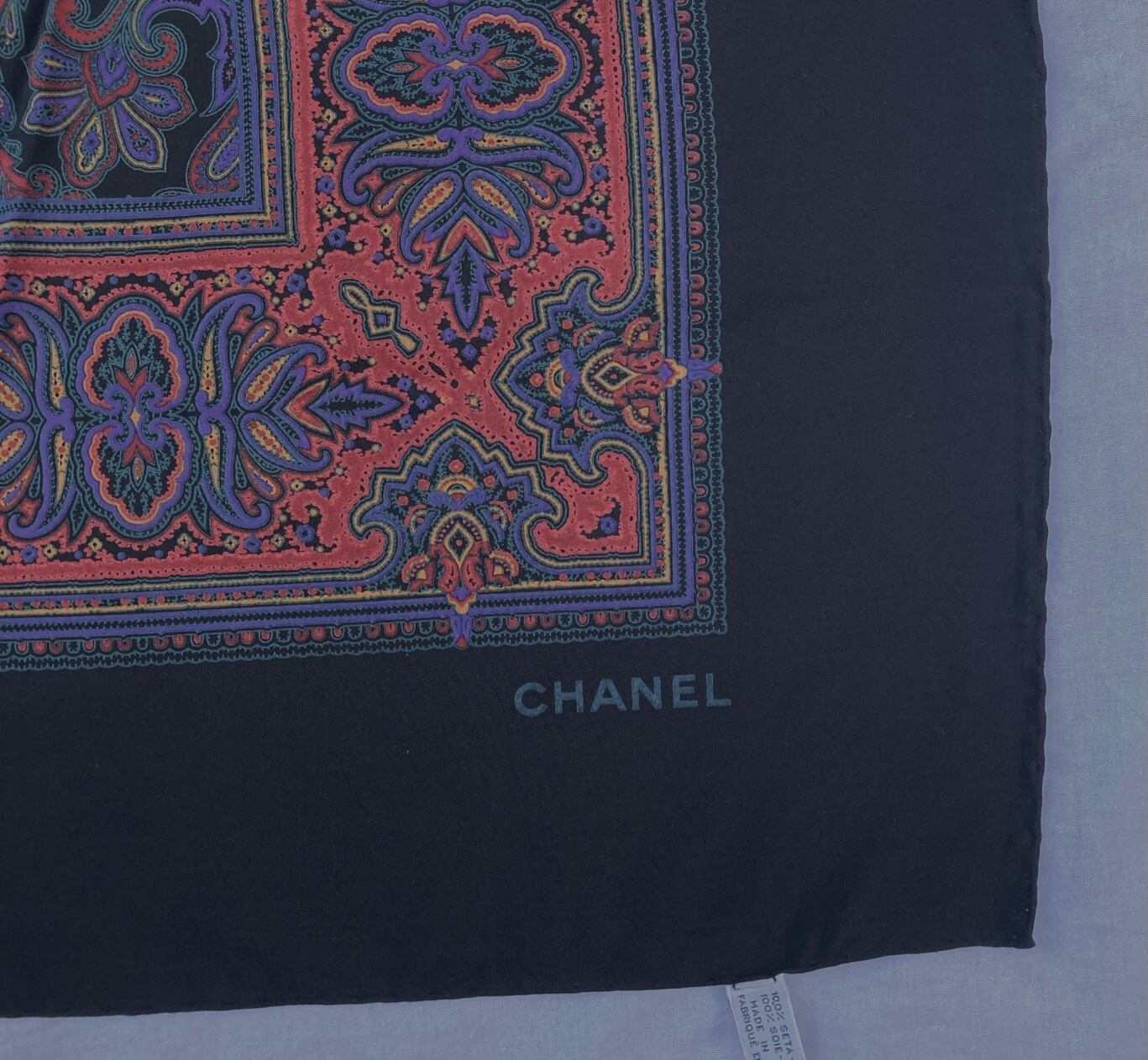 ブラックベースに鮮やかなペイズリー柄が映えるCHANELの超大判シルクストール!