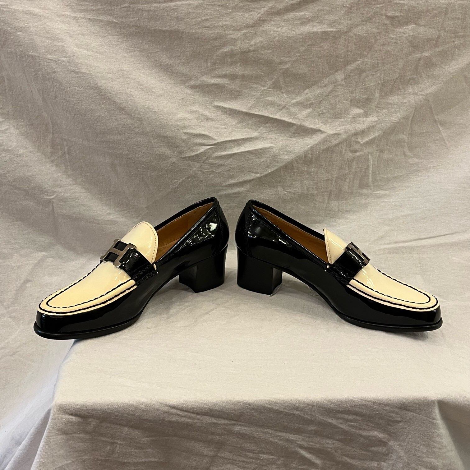 HERMES "H Logo" "Black×Ivory" Heeled Enamel Loafers -Dead Stock!-