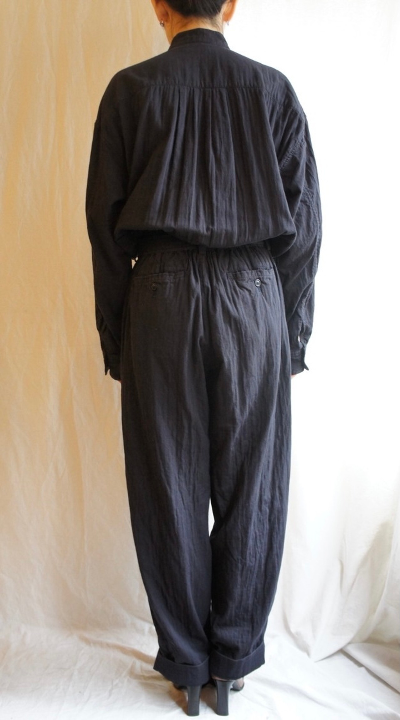 スタンドカラーにキュッと締まるベルトや、背中の細かいギャザー、ウエストのゴムの絞りなどなど、流石のIsseyが創るモード感あふれるオールインワンです☆