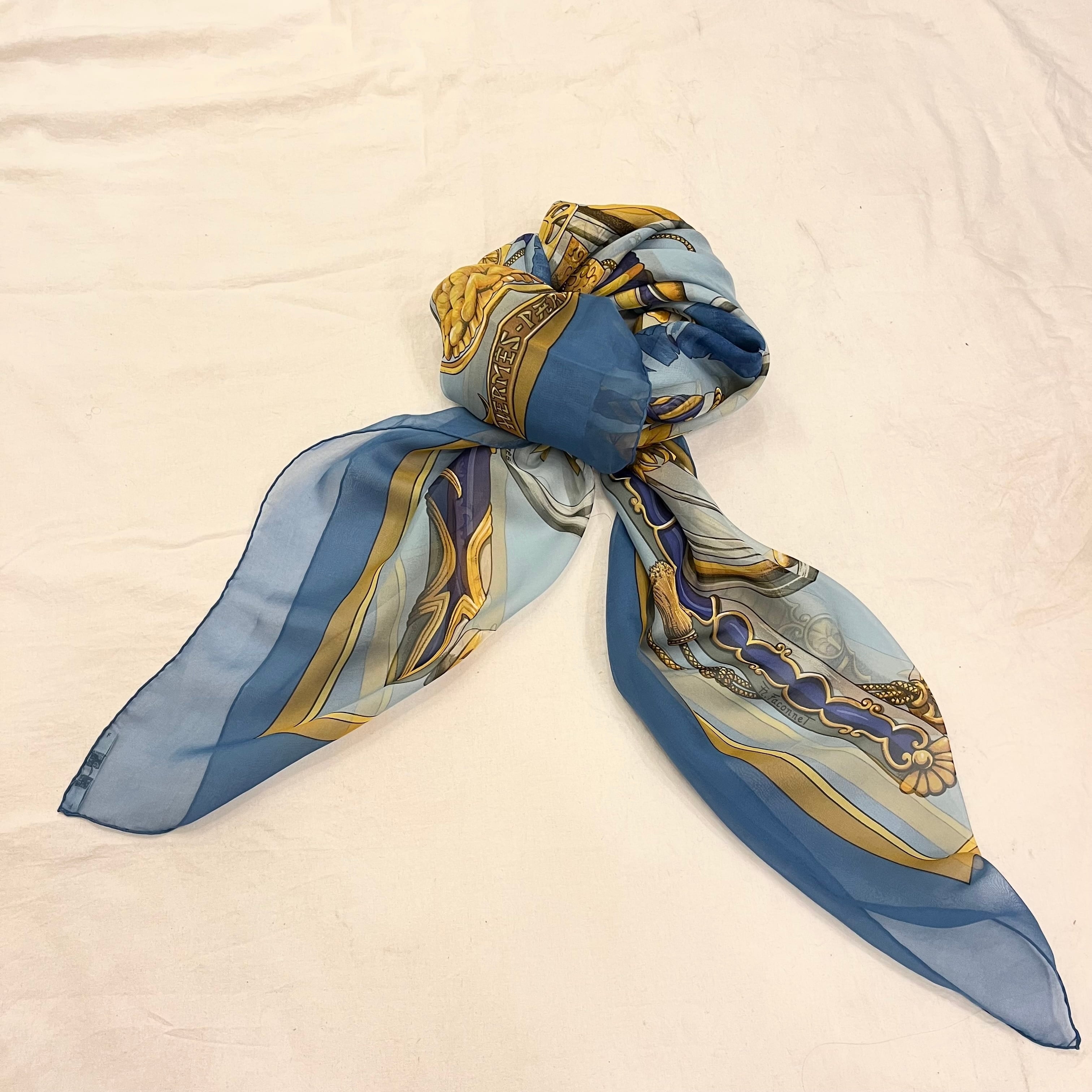 シアーなLight Blueが美しいHERMESのビッグスカーフ!ラグジュアリーなゴールドのモチーフが華やかな印象☆