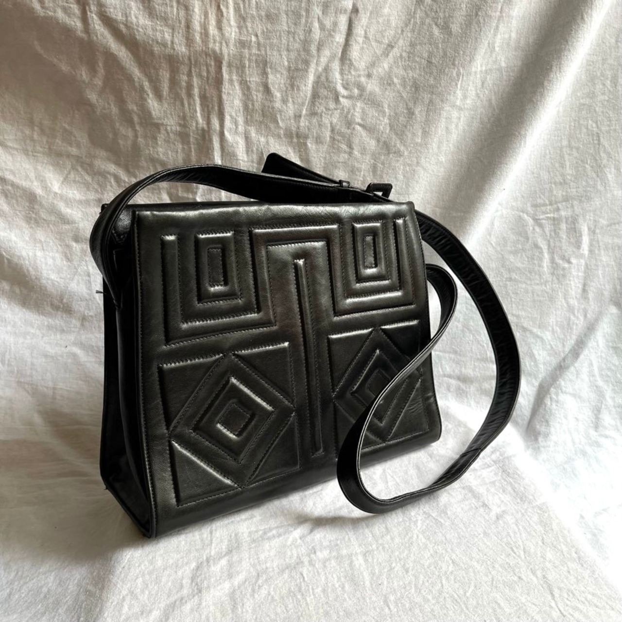 幾何学模様がユニークなPRADAのブラックレザーショルダーバッグ!
