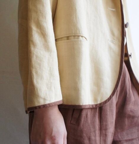 ジャケットはベージュにブラウンのパイピングが効いていて、肩のギャザーやパイピングも流石、ユニーク、丸みを帯びたシルエットが優しいイメージ。