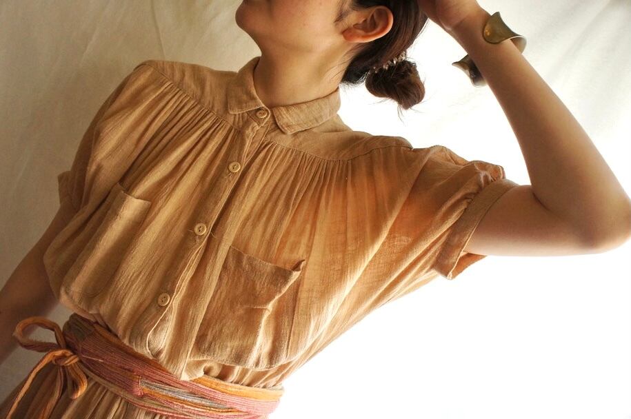 淡いピンクベージュの色味が柔らかいFrance Vintage半袖ワンピース。