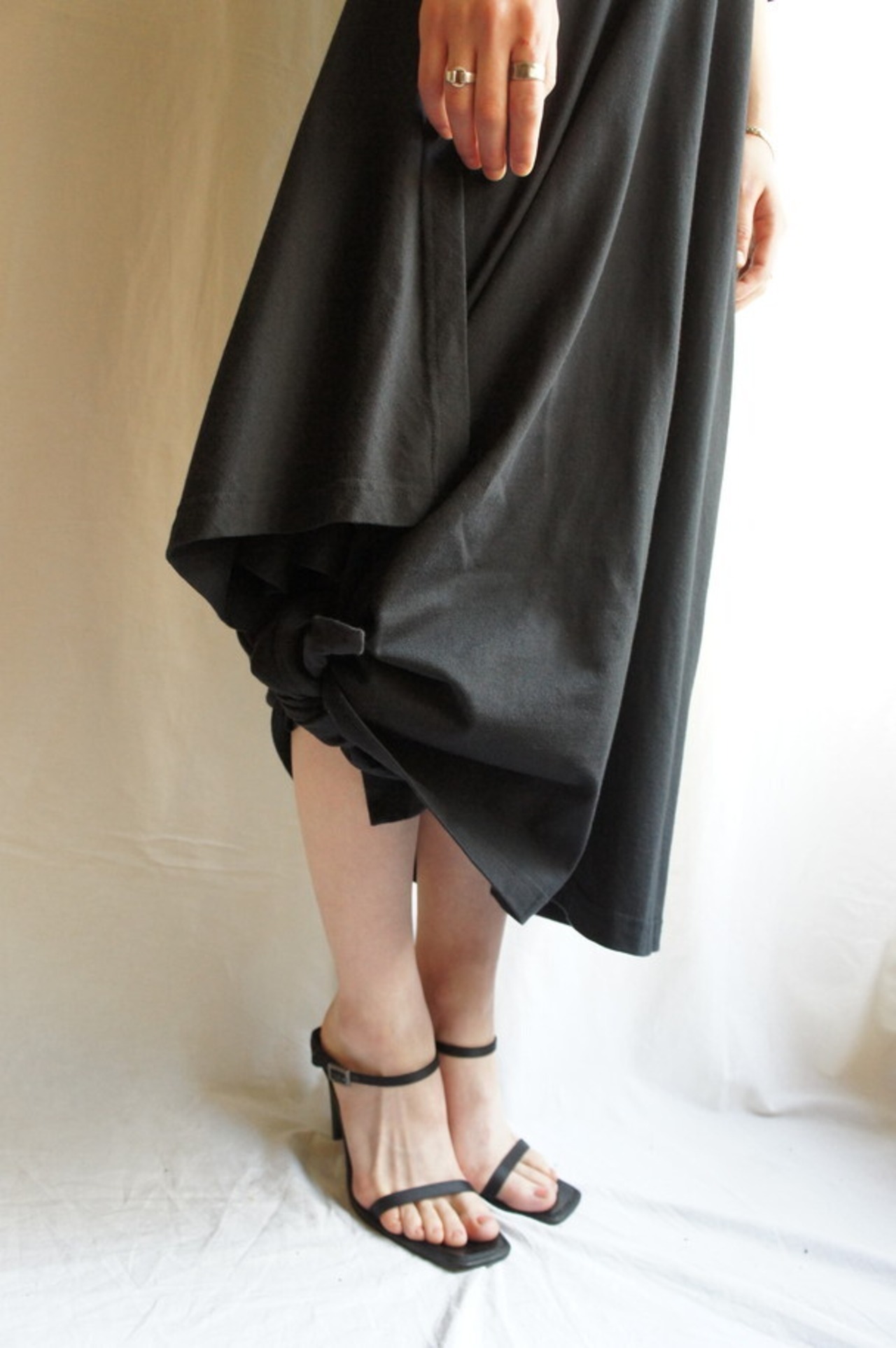 裾の部分を写真のように結んで、バルーンスカートのように楽しんでも!