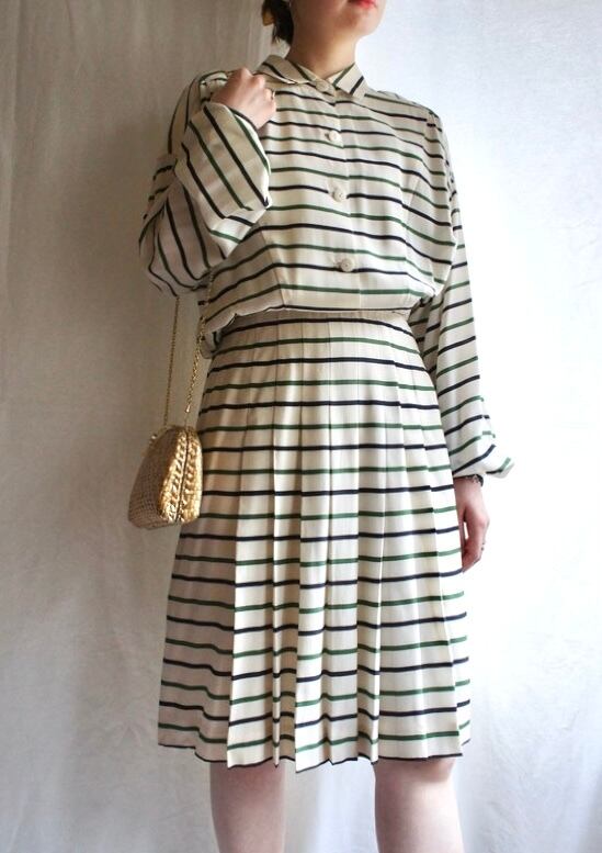 アイボリー地にグリーンとネイビーのボーダーがスタイリッシュなFERRAGAMOの1980's シルク長袖ワンピ!