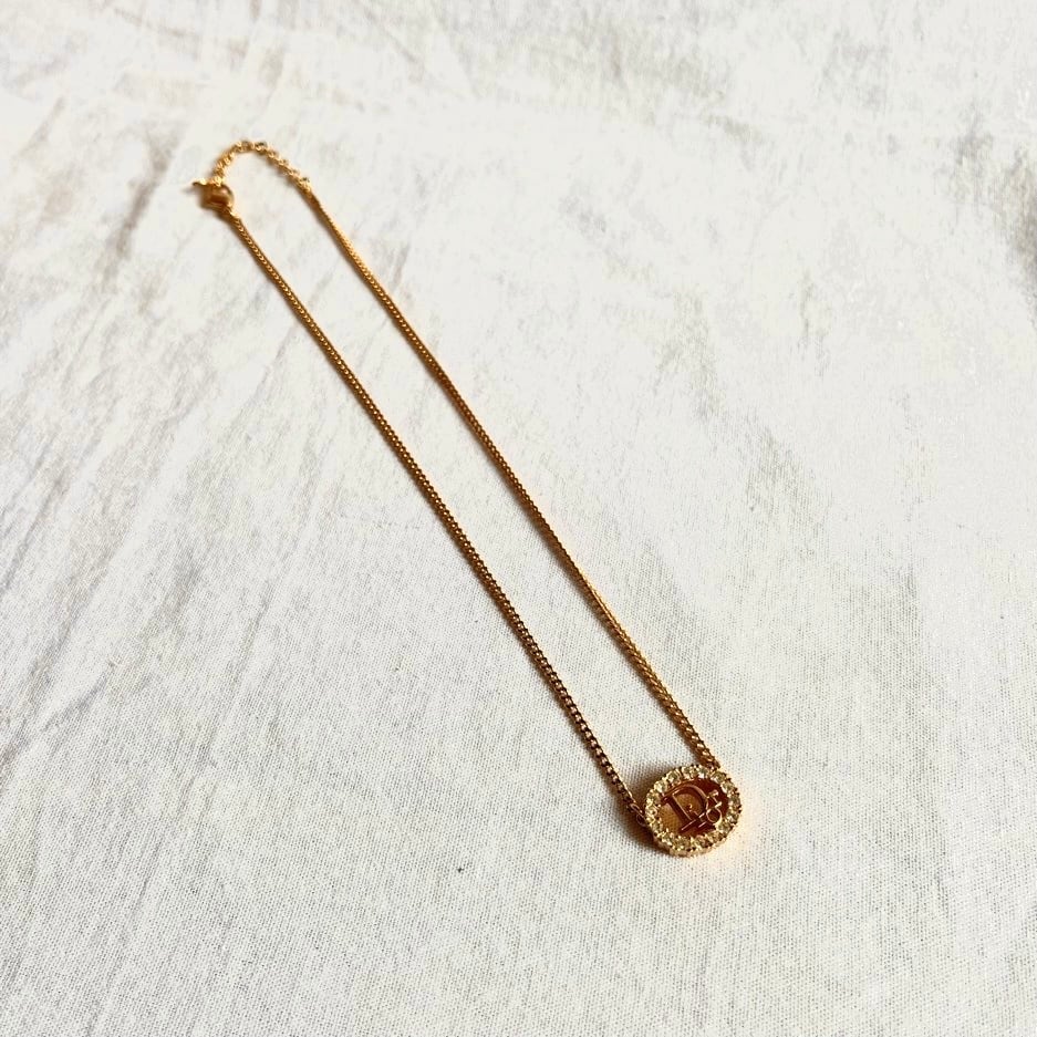 DIOR "Oval Rhinestone × DIOR Logo" Gold Color Necklace