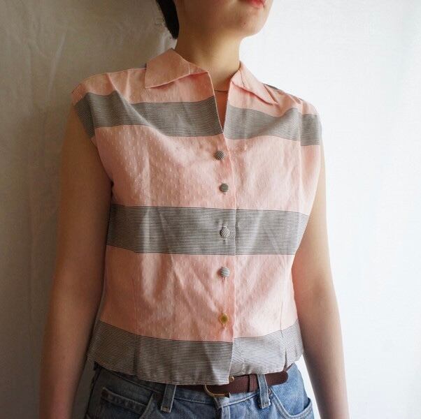 French 1950's "Pale Pink × Grey Stripes" handmade Sleeveless Tops