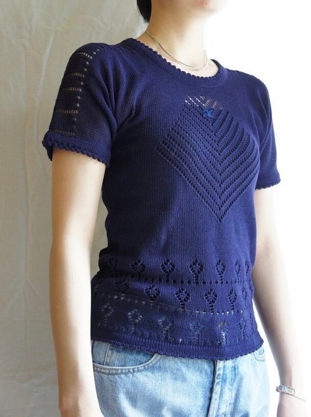 細かいクロッシュ編みの凝ったデザインが芸術的なクレージュ1960'sVintage半袖ニット、レア!