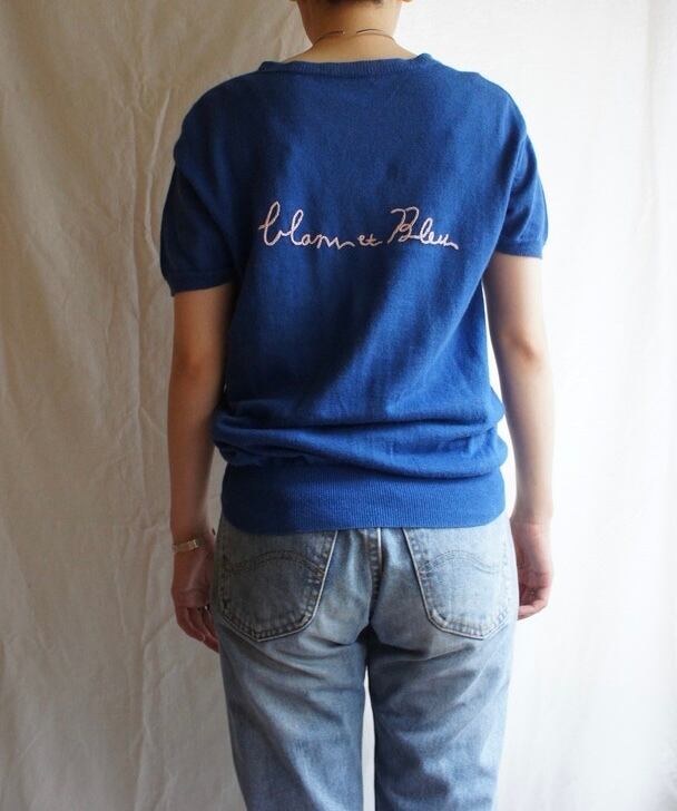 LE CIEL DE HARRISS "Blue × Pale Pink Embroidery" Short Sleeve Knitted Tops