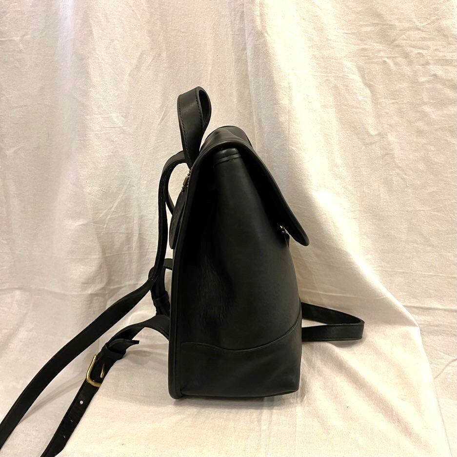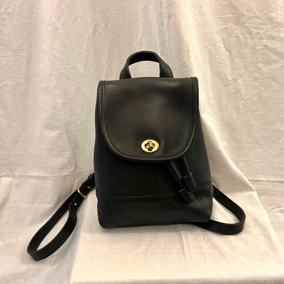 ブラックレザー地にゴールドの金具がCOACHらしいレザーのリュックサック!小ぶりながらもペットボトルもすっぽり収まるサイズ感☆