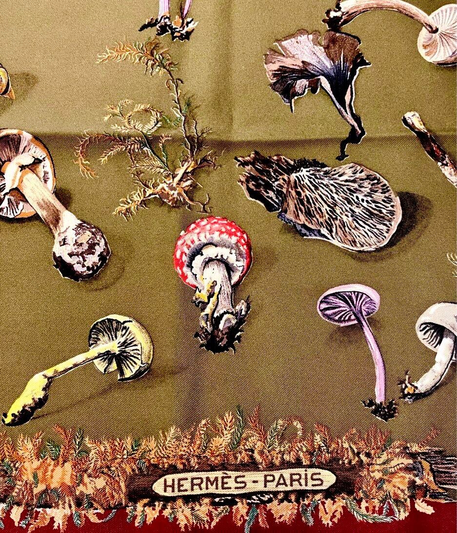 HERMES "Khaki × Bordeaux" Mushroom Motif Scarf