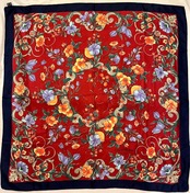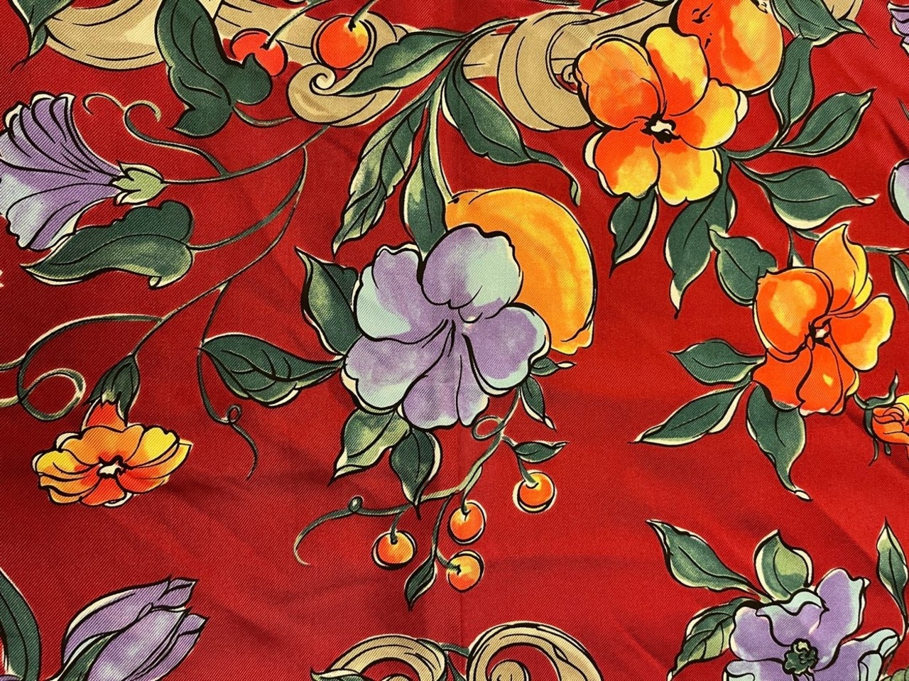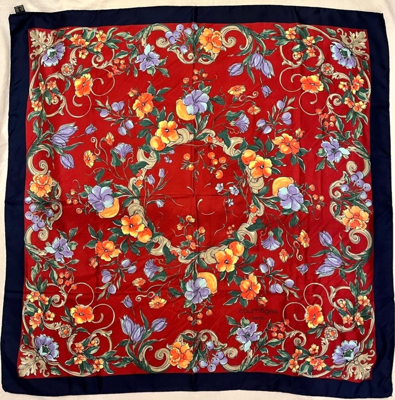 深い赤とネイビーのベースに鮮やかな花や木の実の絵柄が映えるクレージュのスカーフ!
