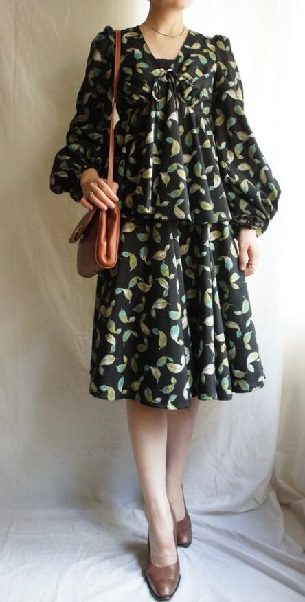 ブラック地にグリーンの葉っぱ柄がエッジの効いたKANSAIの1980's Vintageドレス、レア!