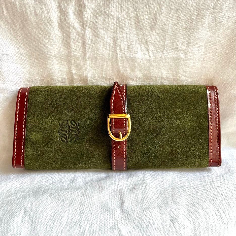 カーキのスエード地につやのあるブラウンレザーのパイピングがマニッシュなコンビのアクセサリーケース!