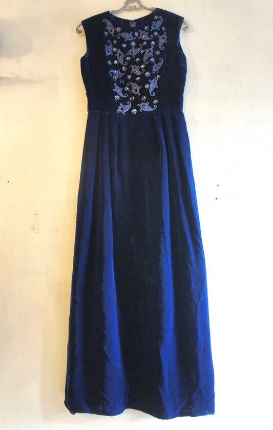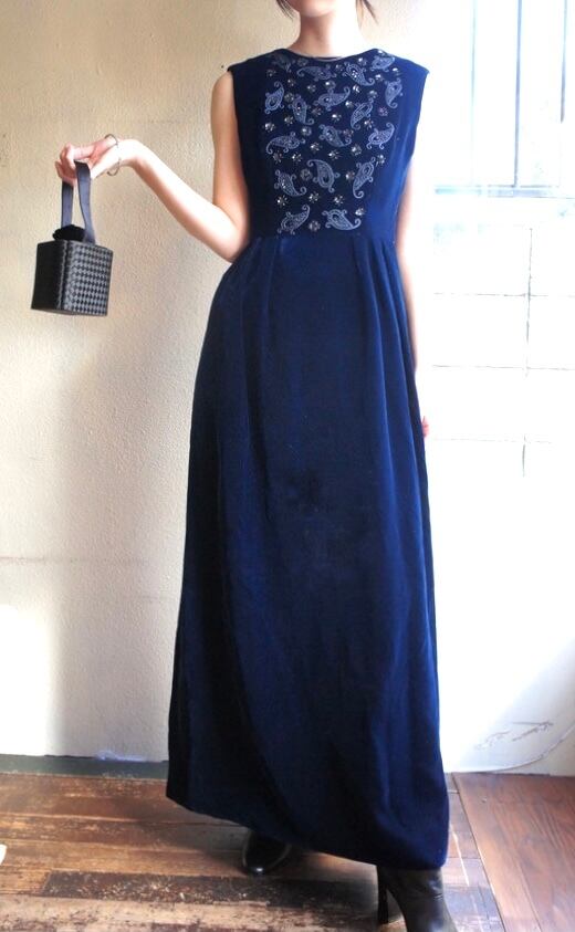 ネイビーの上質な厚地のベロア生地にビーズで施されたペイズリーが優雅な、80’s vintage Dior ドレス。