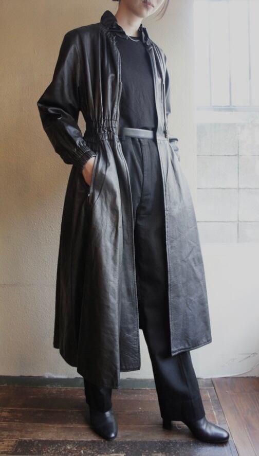 ブラックレザーのフリルの効いたネック、ウエストや袖の幅広ギャザーの優雅なAラインシルエットがとてもフェミニン。