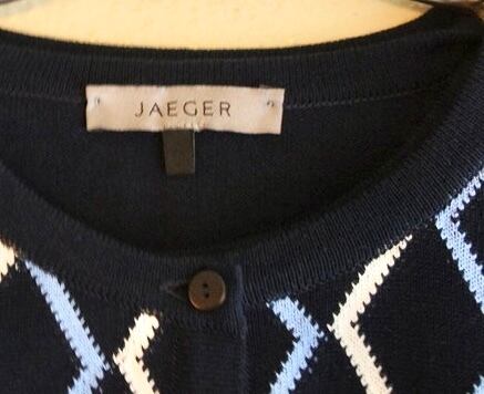 Dark Navy地に水色と白のアーガイルチックなひし形デザインが上品なJAEGERのニットトップスとカーディガンのセット!Dead Stock☆☆
