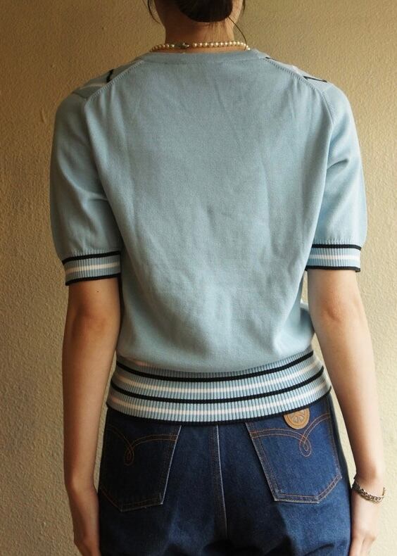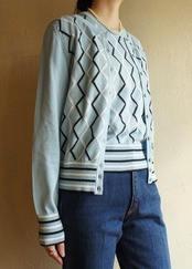 水色地にブラックとホワイトのアーガイルチックなひし形デザインが上品なJAEGERのニットトップスとカーディガンのセット!Dead Stock☆☆