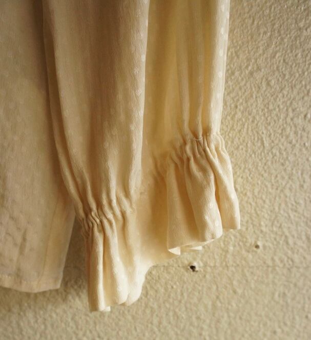 光沢のあるドット柄、くるみボタン、袖のギャザードレープなどとてもエレガントな一枚☆