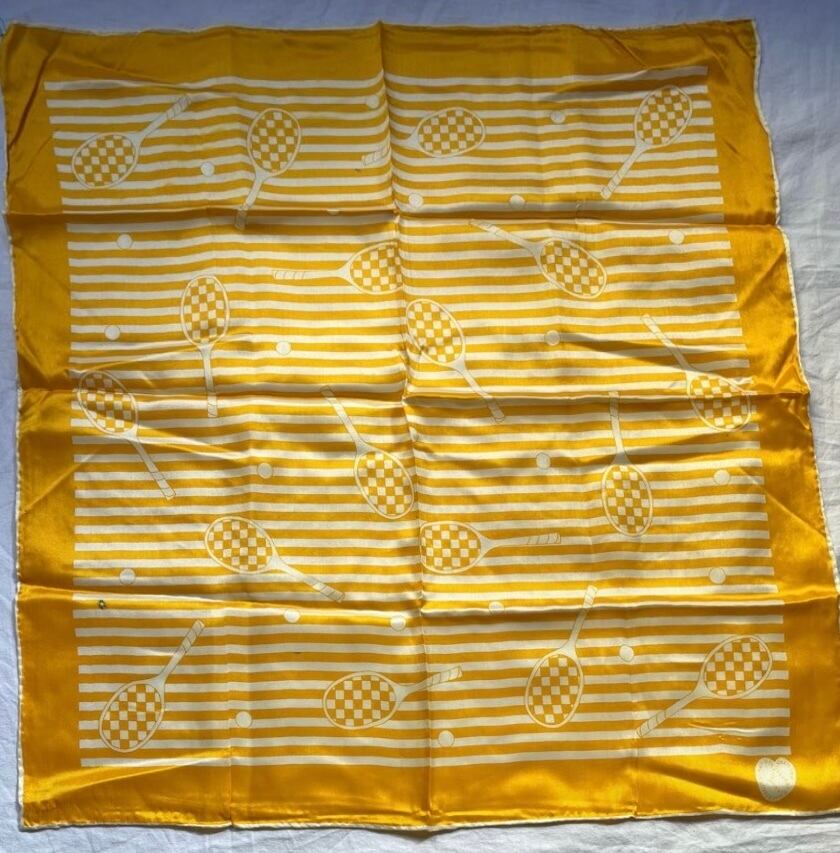 テニスラケットにボールデザインがスポーティーな絵柄のUS 60-70's Deadstock のスカーフ、5セットです。!
