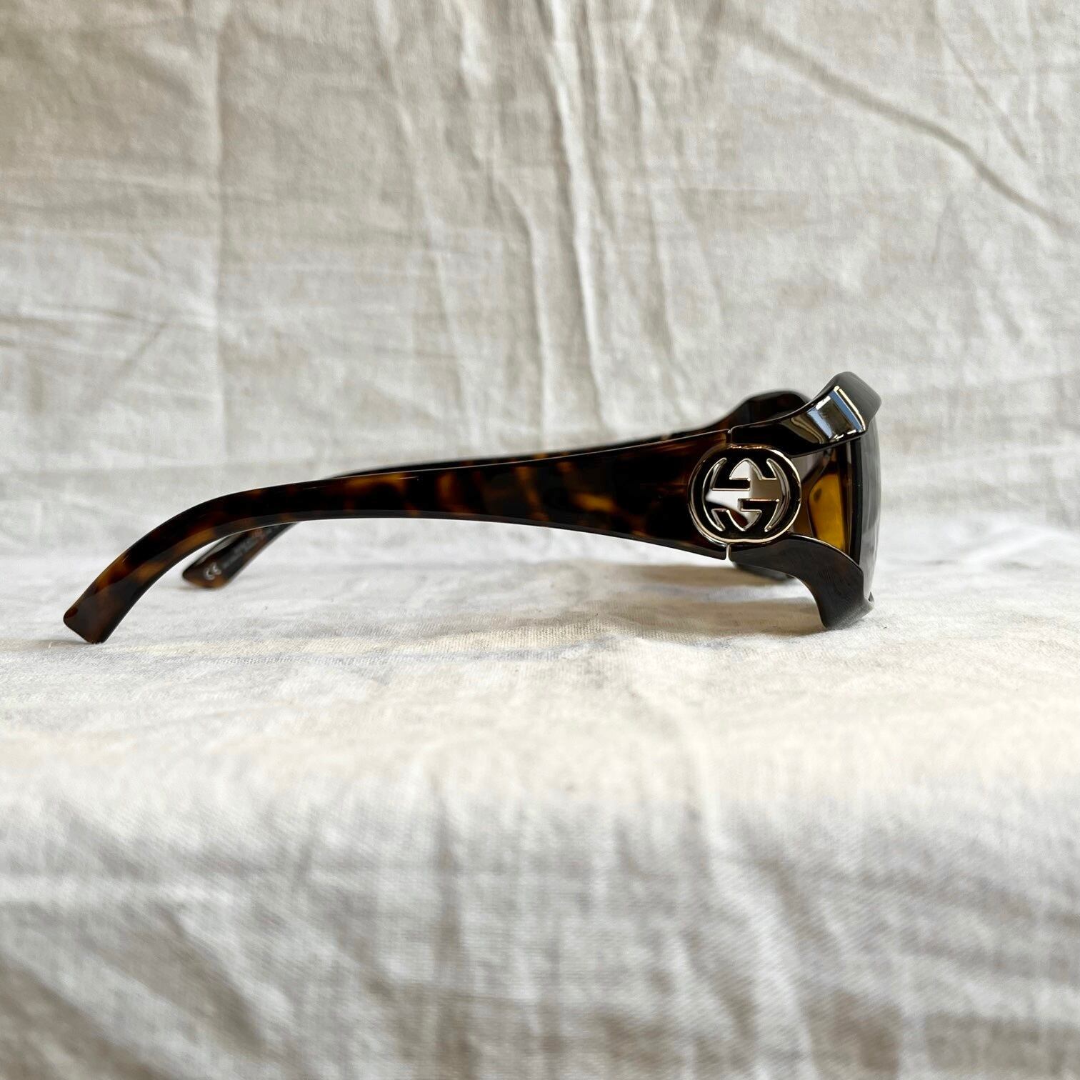 角ばったフレームがマニッシュなGUCCIのサングラス。べっ甲風のフレームがクラシックな印象も…。サイドのGGメタルロゴもアクセントに効いた一品です。