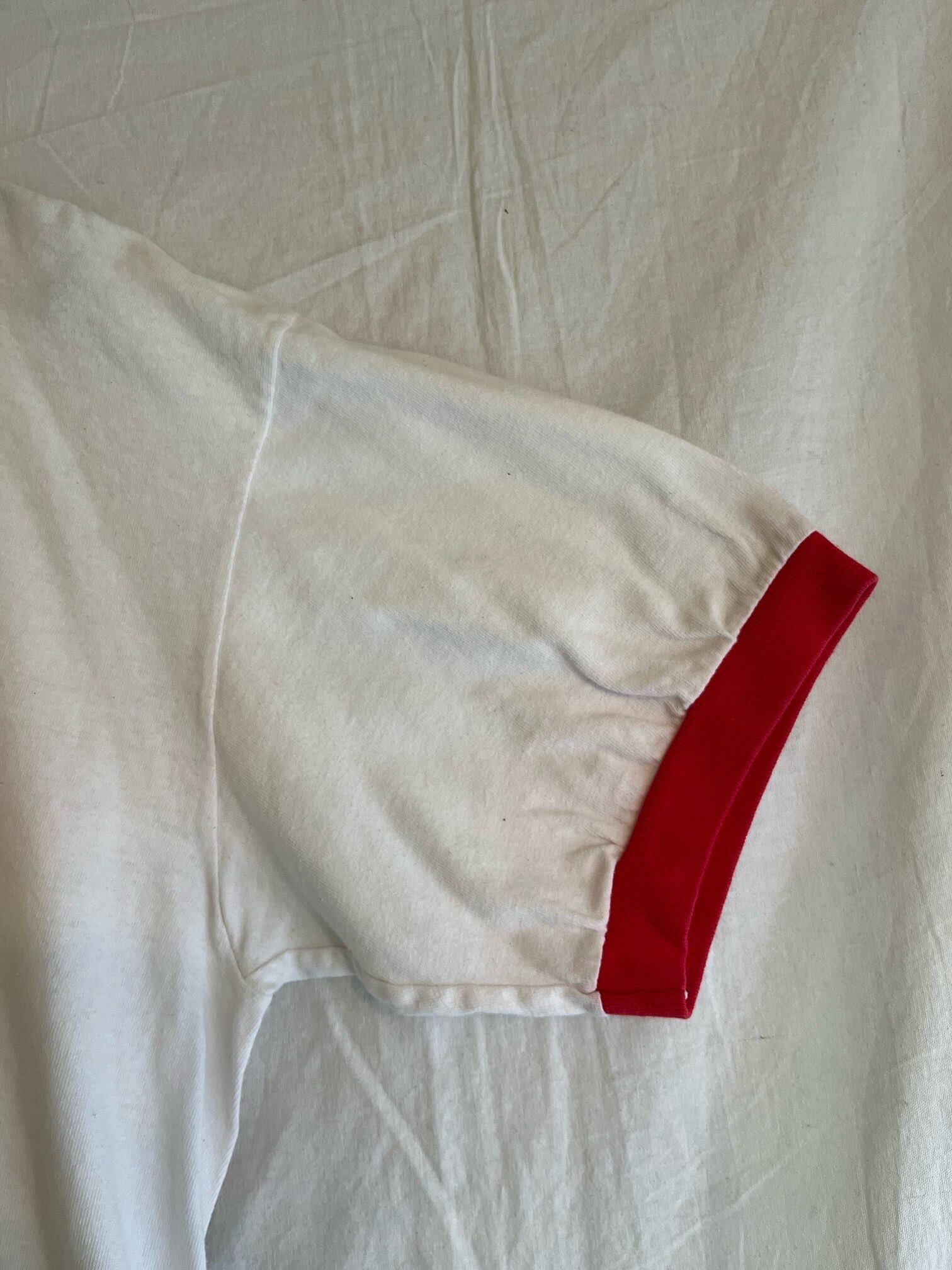 白地に赤のパイピングがアクセントに効いたU.S.90’s VintageリンガーTシャツ。前後のプリントが、たまらなくcute!