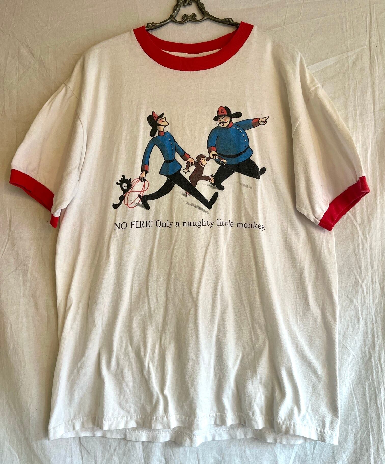 絵本の表紙でもお馴染み。。レアな逸品!火事は起きていないのに消防士さんを呼んでいたずらをしたおさるのジョージのプリントがユーモアのあるデザイン。遊び心あふれる一枚です。