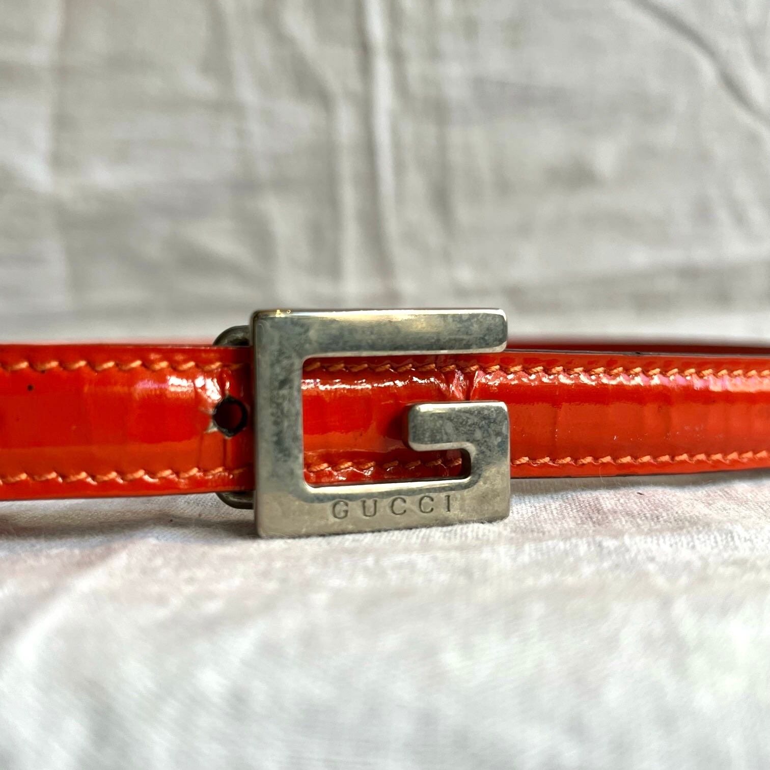 オレンジがかった赤いエナメル地が差し色にピッタリなGUCCIのベルト。極細のベルトが気品のある存在感シルバーのGロゴバックルは角張ったデザインでスポーティーさが魅力の一品です。