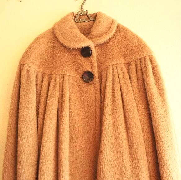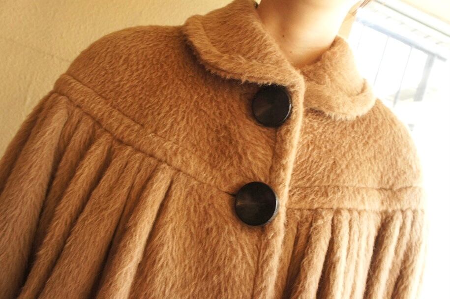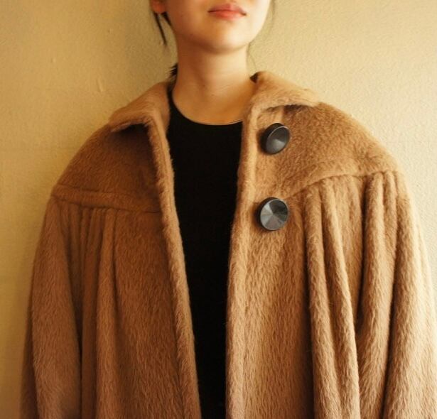 アルパカ素材ならではなふわふわとした起毛感が高級感のある肌触り。丸襟にキュッと絞まった袖、ビックボタンなどディテールもcuteな一枚。たっぷりのギャザーでふわっと広がるシルエットも美しいです。