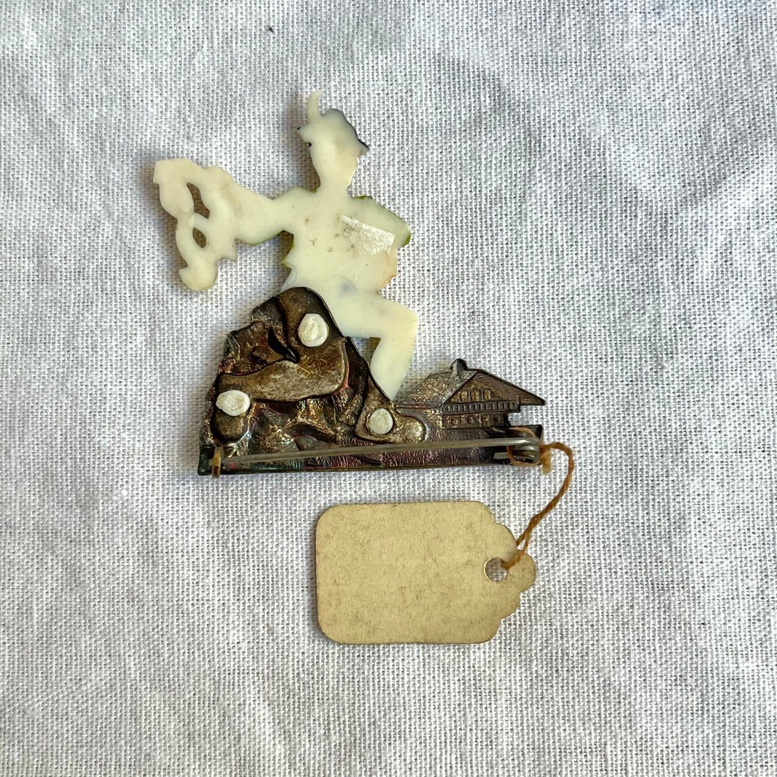 口笛をふきながらギターを奏でる男の子のモチーフが遊び心のあるFrance 60's vintageブローチ。山岳地帯と思われる背景の描写も非常に凝った逸品です。