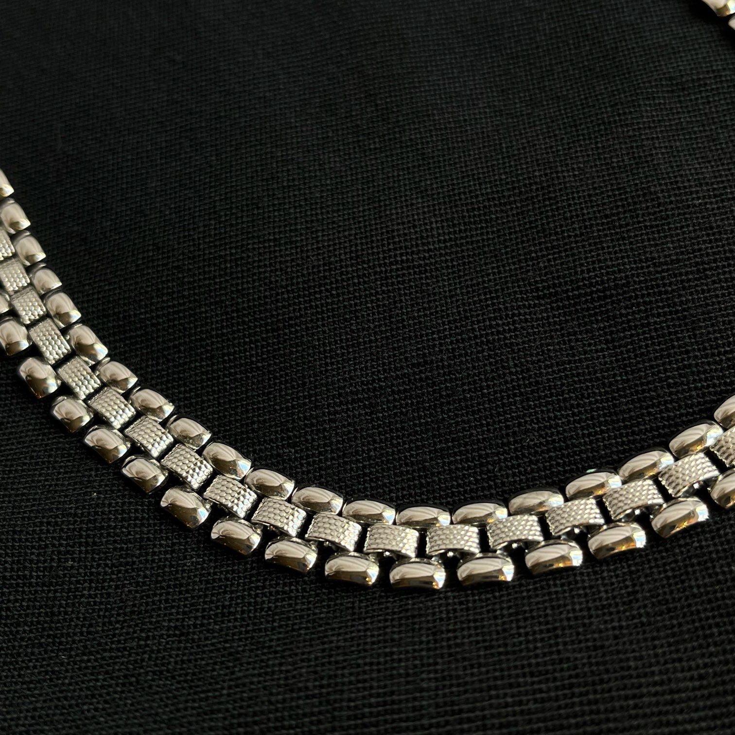短めのチョーカーテイスト!ブロック状のデザインがモードなMonetのネックレス。つやのあるモチーフと凸凹のあるモチーフのMIXが表情豊かなデザイン。太めで存在感のある一品です。パーティードレスなどにも、カジュアルにも。!