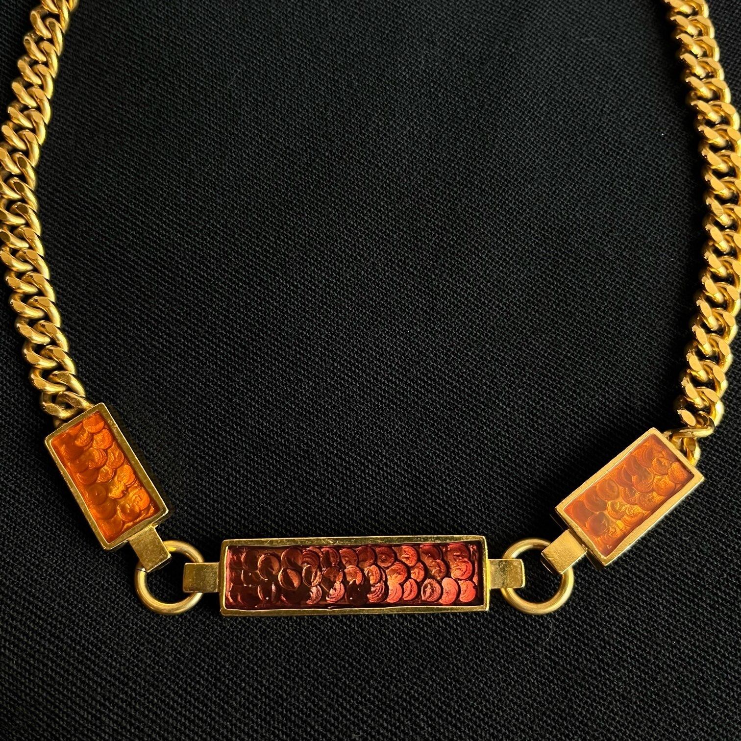 アンバーカラーの長方形のモチーフがクラシカルなFrance 80’s Jean-Lovis Scherrerのチョーカー。モチーフの中はウロコのような波打つデザインになっていて、職人技の光る一品。ボリュームのあるゴールドのチェーンもアクセントに効いてます!
