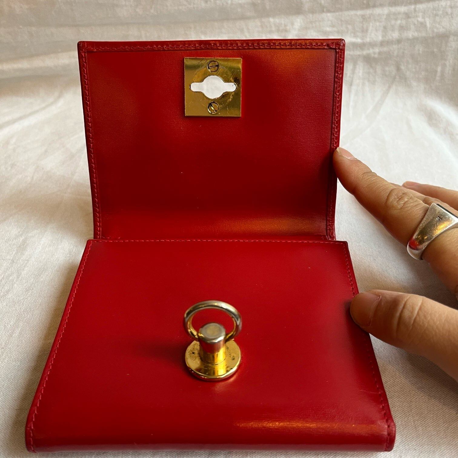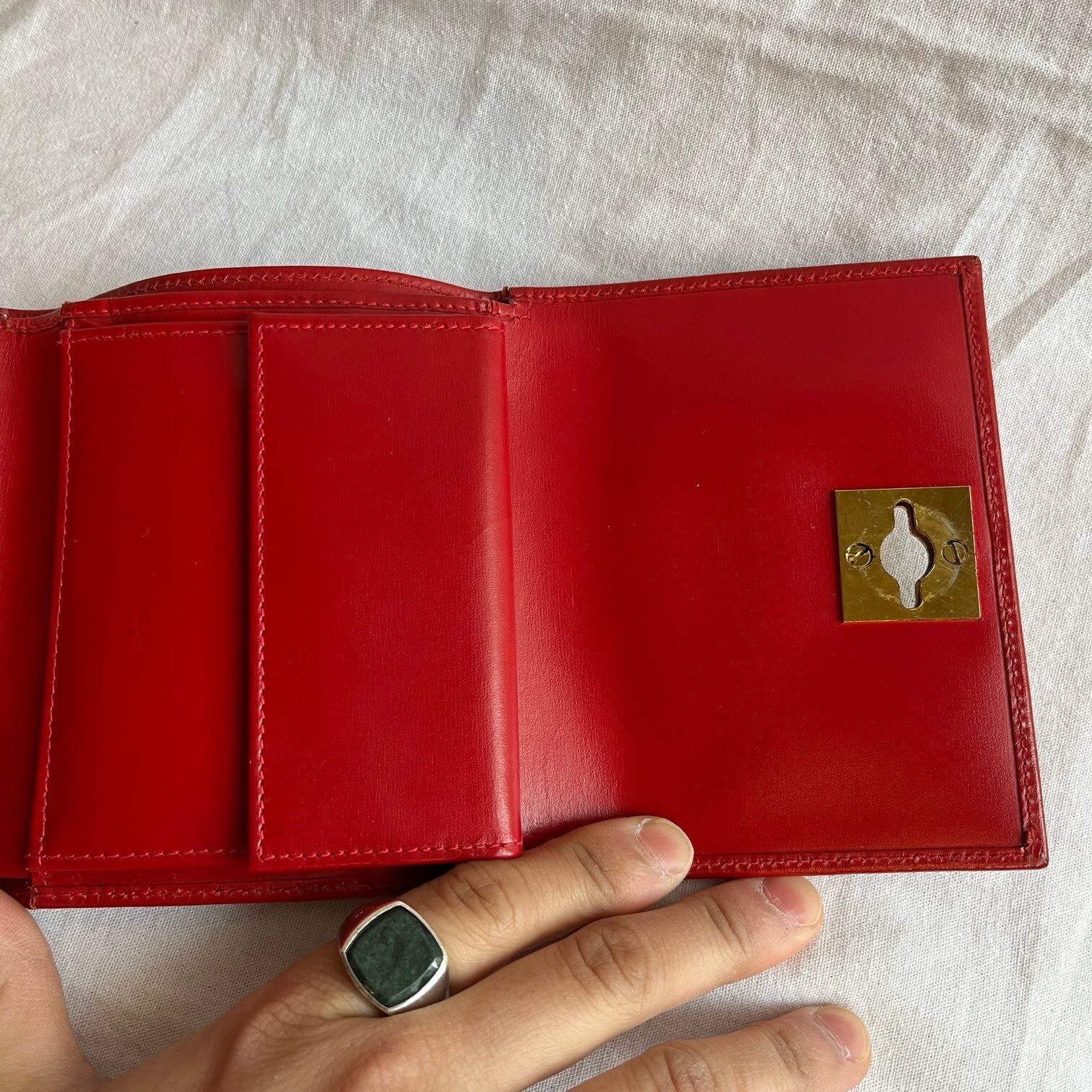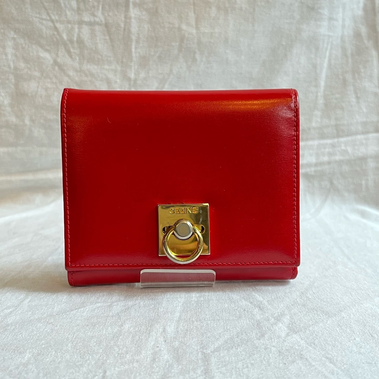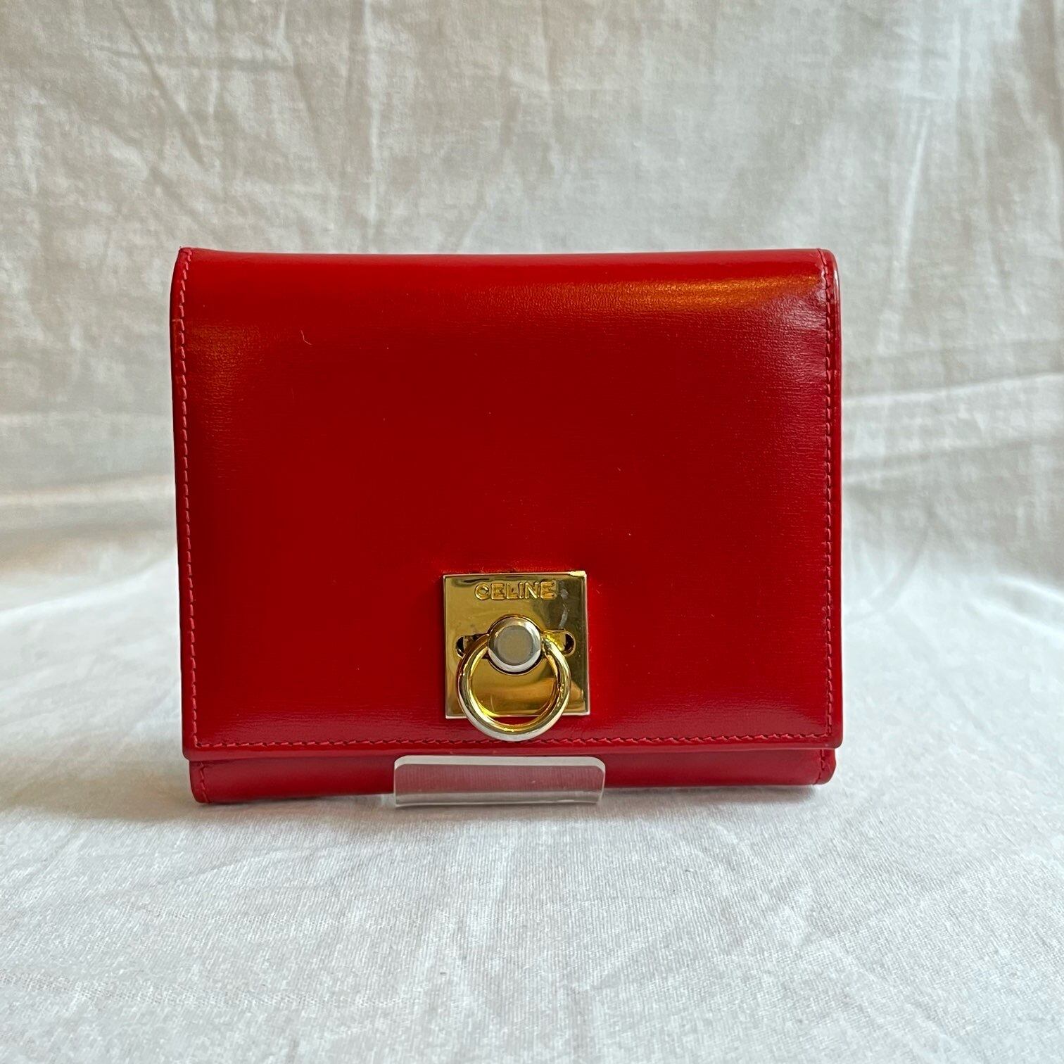 真っ赤なレザーにゴールドのガンチーニが華やかなcelineの折りたたみ財布。つるんとした質感のレザーが高級感のある肌触り。中を開けるとゆとりのある大きく見やすい作りで、収納しやすい。使い心地も良い一品です。