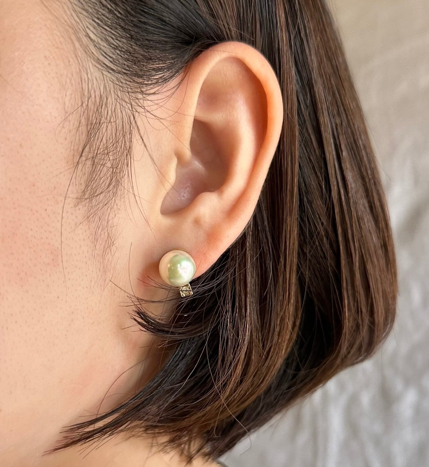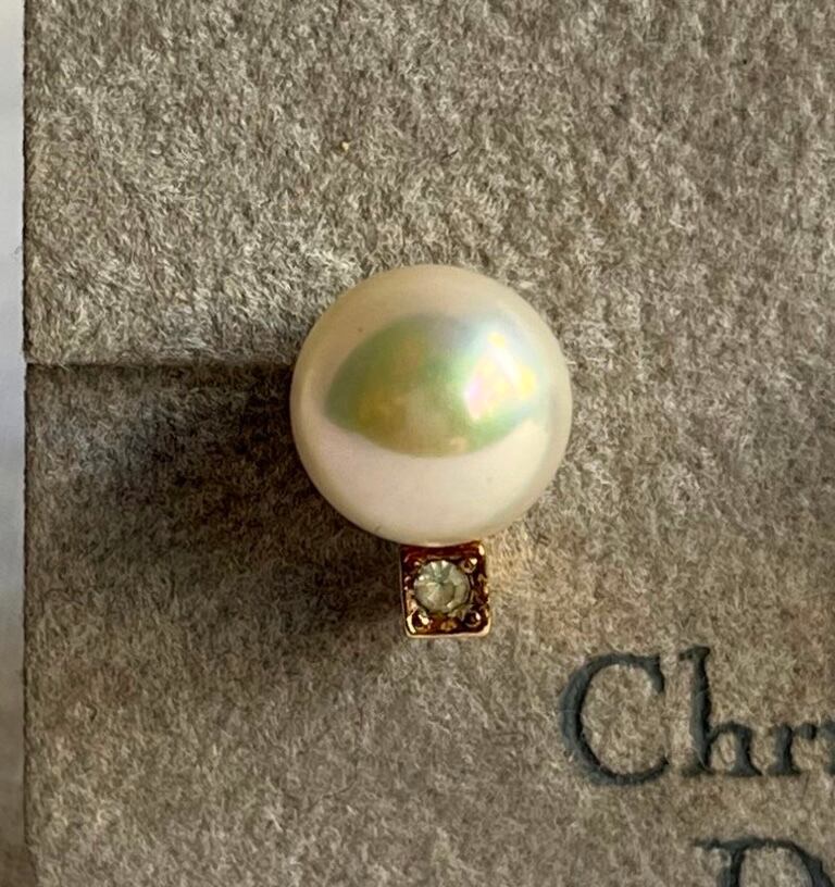 大きめなパールモチーフが存在感のあるDIORのピアス。下ののcube型のゴールドモチーフの中には小さなラインストーンが施されていて、大胆さと繊細さのバランスが◎ デイリーにもフォーマルにもオススメです。