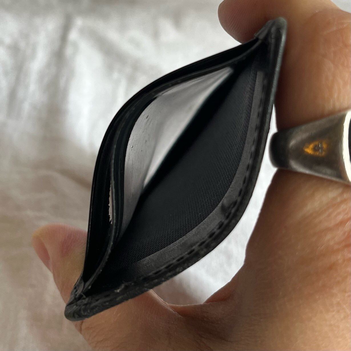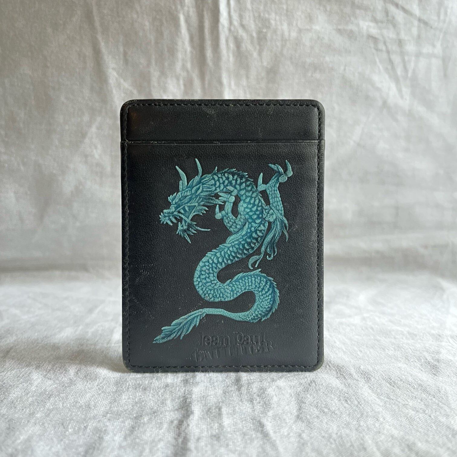 マットなブラックレザー地に凸凹のある龍のモチーフが中華系モードなゴルチエのカードケース。くすんだブルーの龍が芸術的なデザイン。薄型なのでポケットににもさっと入り、収まりの良い一品です。