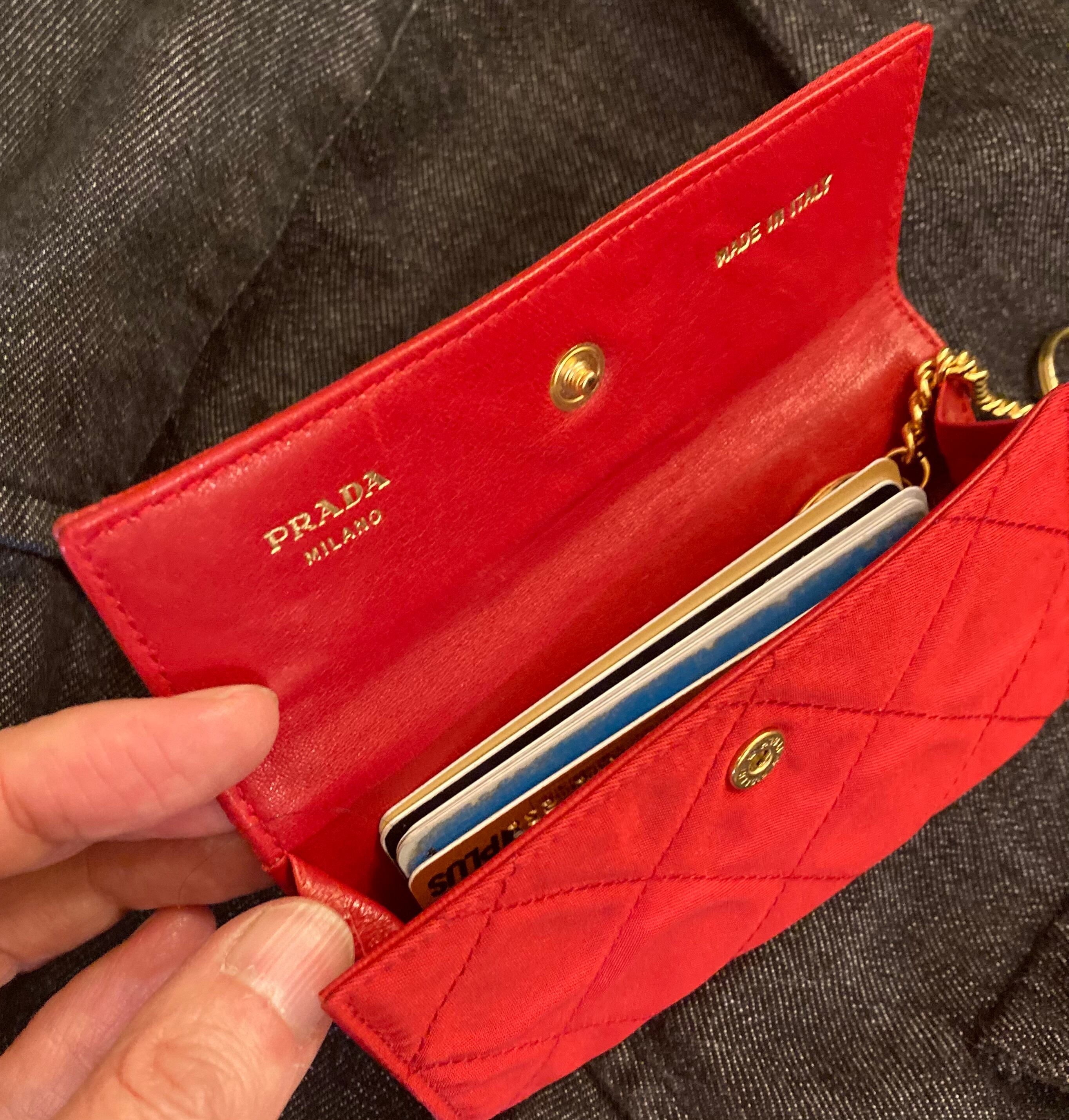 真っ赤なナイロン地のキルティングが目をひく PRADAのカードケース。内側のラムのような高級レザーがリッチな気分☆