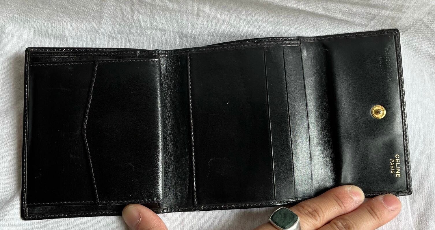 つやのあるブラックレザー地にゴールドのビットモチーフが映えるceline80's vintage, かなりコンパクトな折りたたみ財布、レア!嬉しいdeadstock !