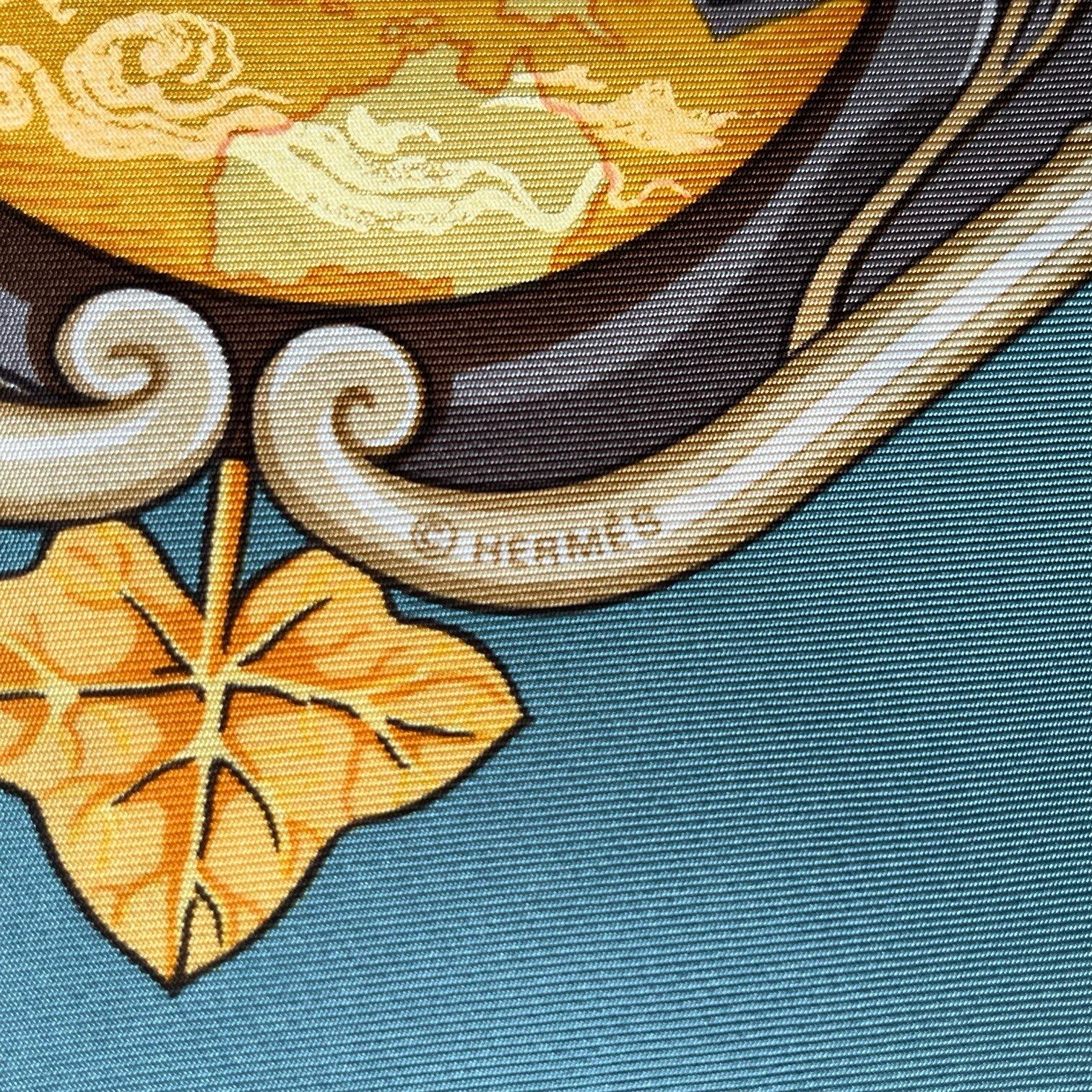くすんだエメラルドブルーとイエローのコンビが上品かつ繊細なHERMESのスカーフ。太陽と月、星座のモチーフが神秘的な絵柄です。天地創造を思わせるフチのプリントから、豊かな創造のふくらむ一品。Deadstock箱付きなのでギフトにもオススメです。