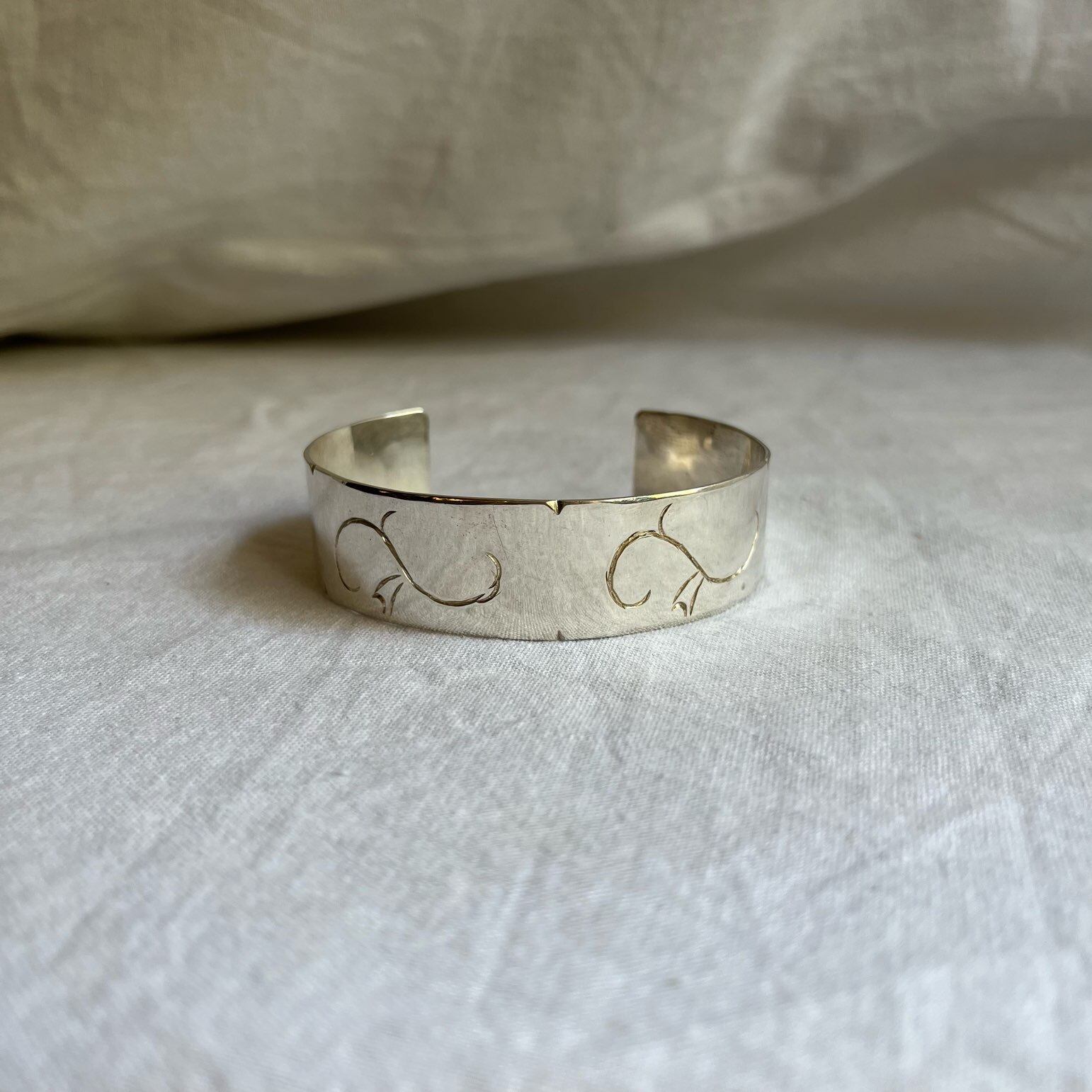 艶やかなシルバーに手彫りの曲線がやわらかい雰囲気のあるイギリスシルバーバングル。