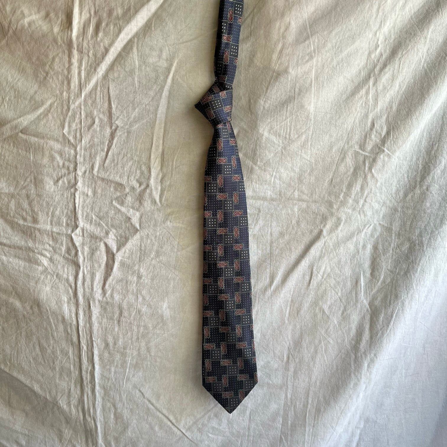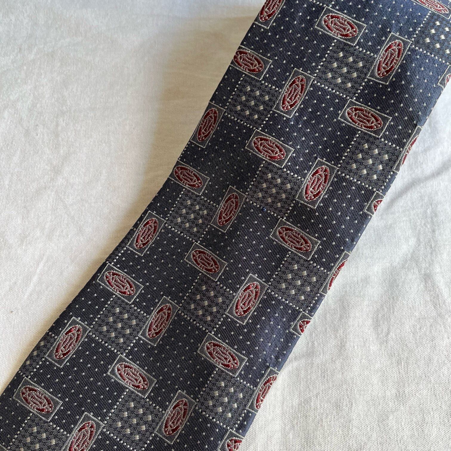 異なるシェイプのスクエアとドットの幾何学模様がモードなCHANELのシルクネクタイ!よく見るとスクエア内の色も異なる組み合わせで小さいスクエアには透かしの様な模様も!バーガンディーの丸いモチーフも効いていて、オン・オフ問わずに使える一品です。
