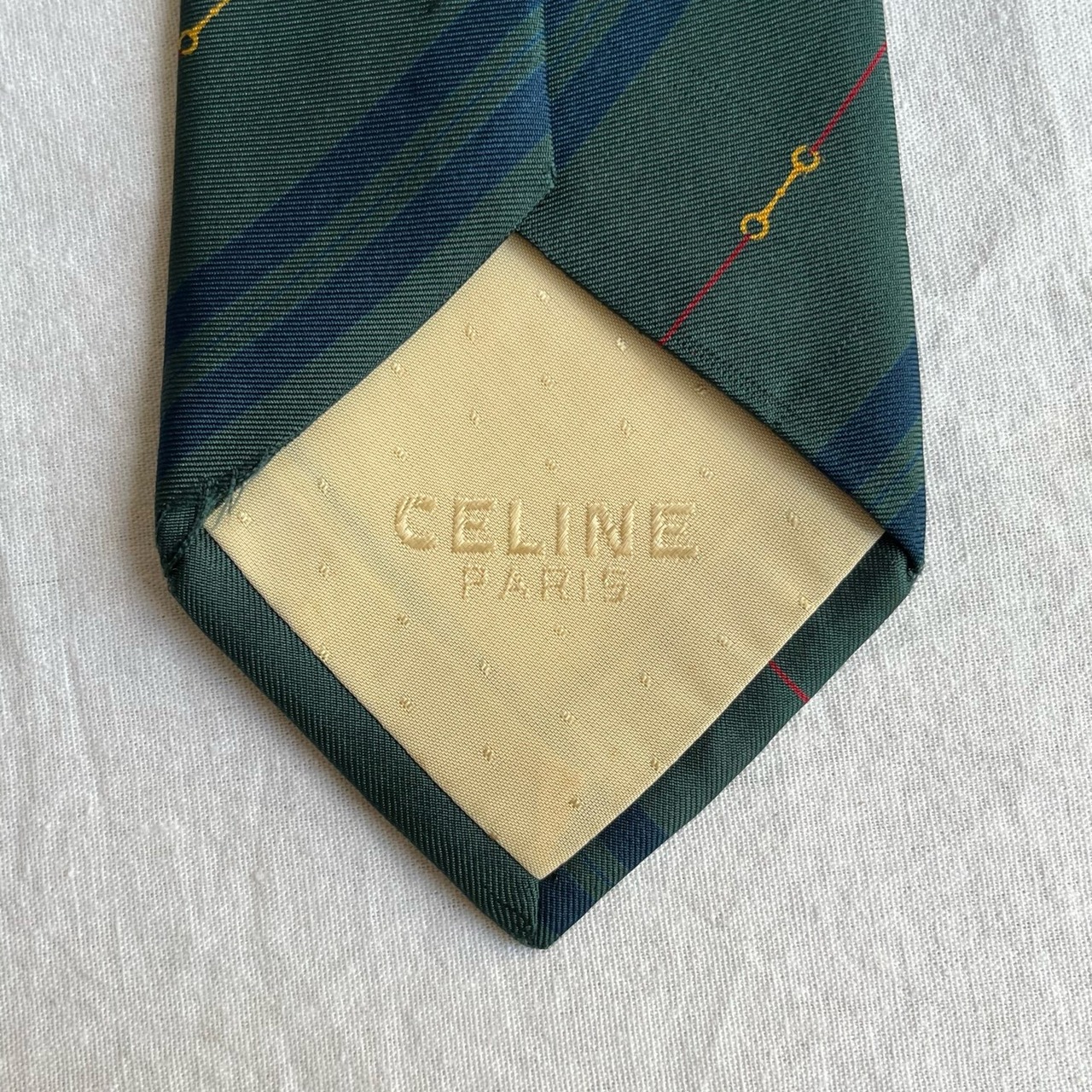 深みのあるグリーンにスリムなストライプラインがスタイリッシュなceline 80’s vintageのシルクネクタイ!