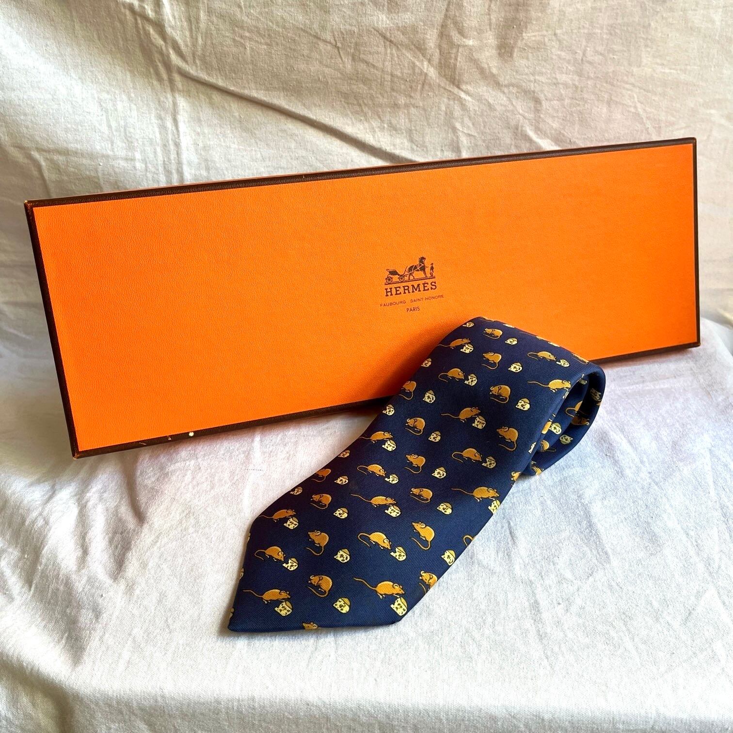 HERMES “Mouse × Cheese” “Navy” Silk Tie