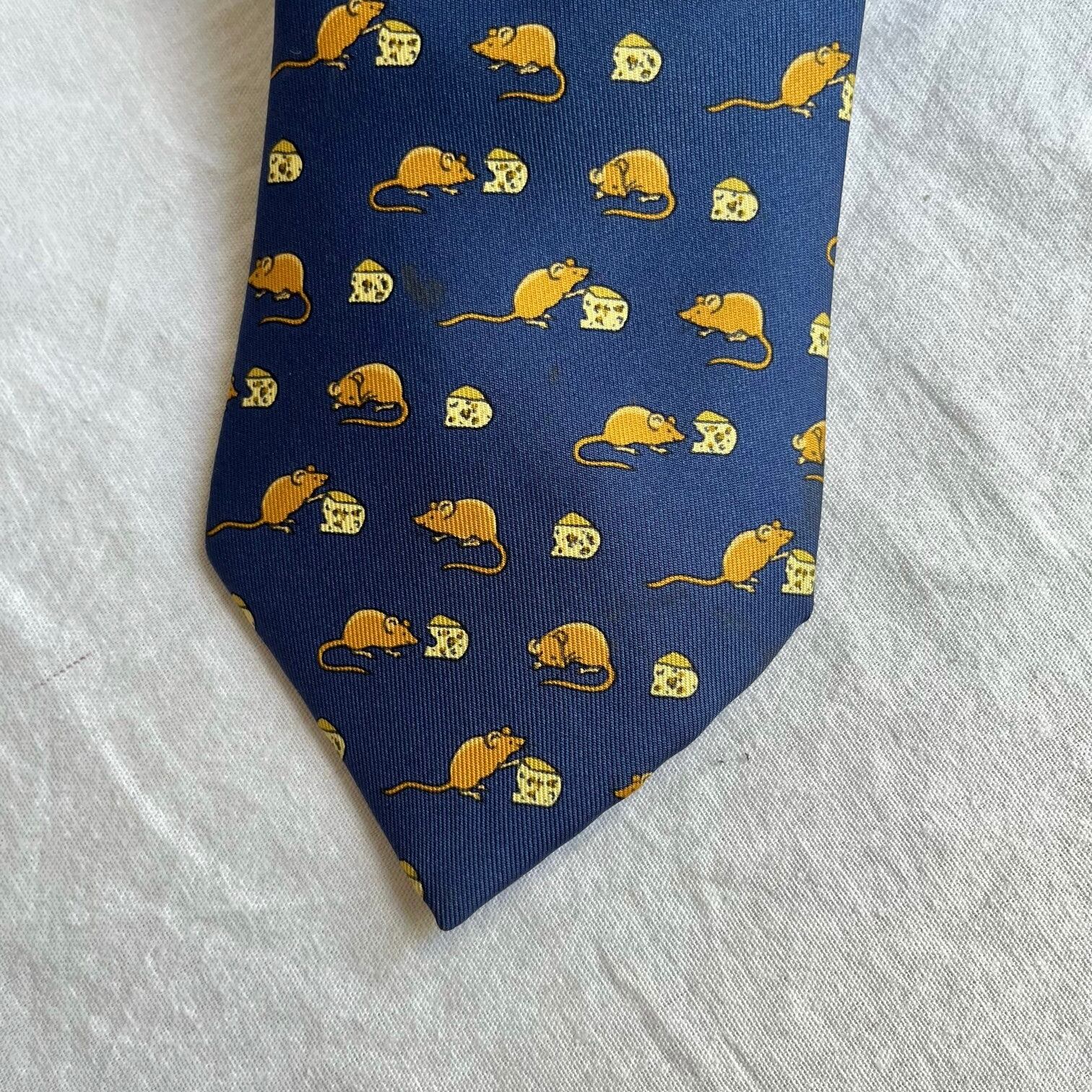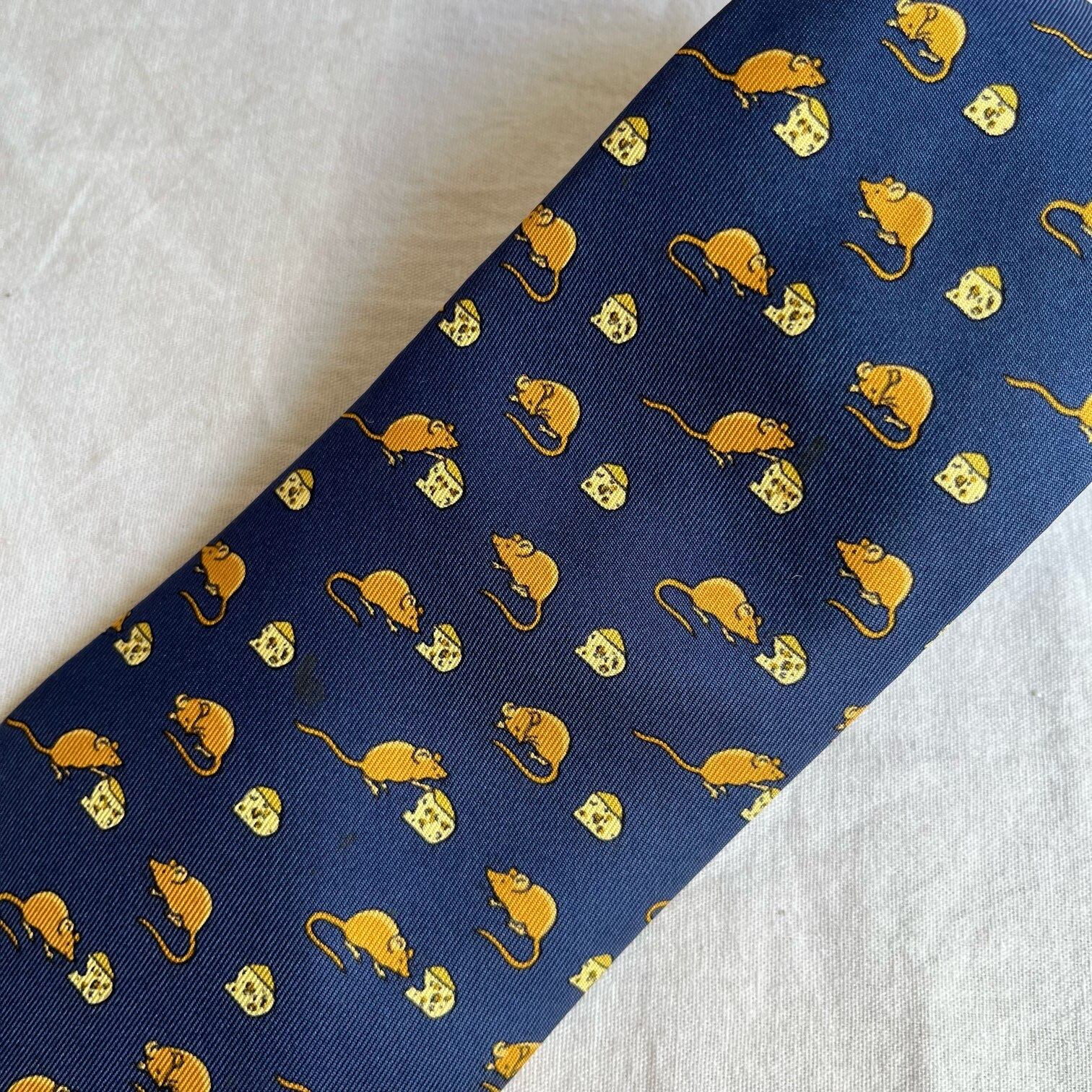 絶妙な色味のネイビー地に散りばめられたマウスとチーズのモチーフが笑顔を誘うHERMESのシルクネクタイ!よく見るとマウスもチーズもポーズ違いがあったりと、さすが HERMESの遊び心を感じる一品です!cute!!