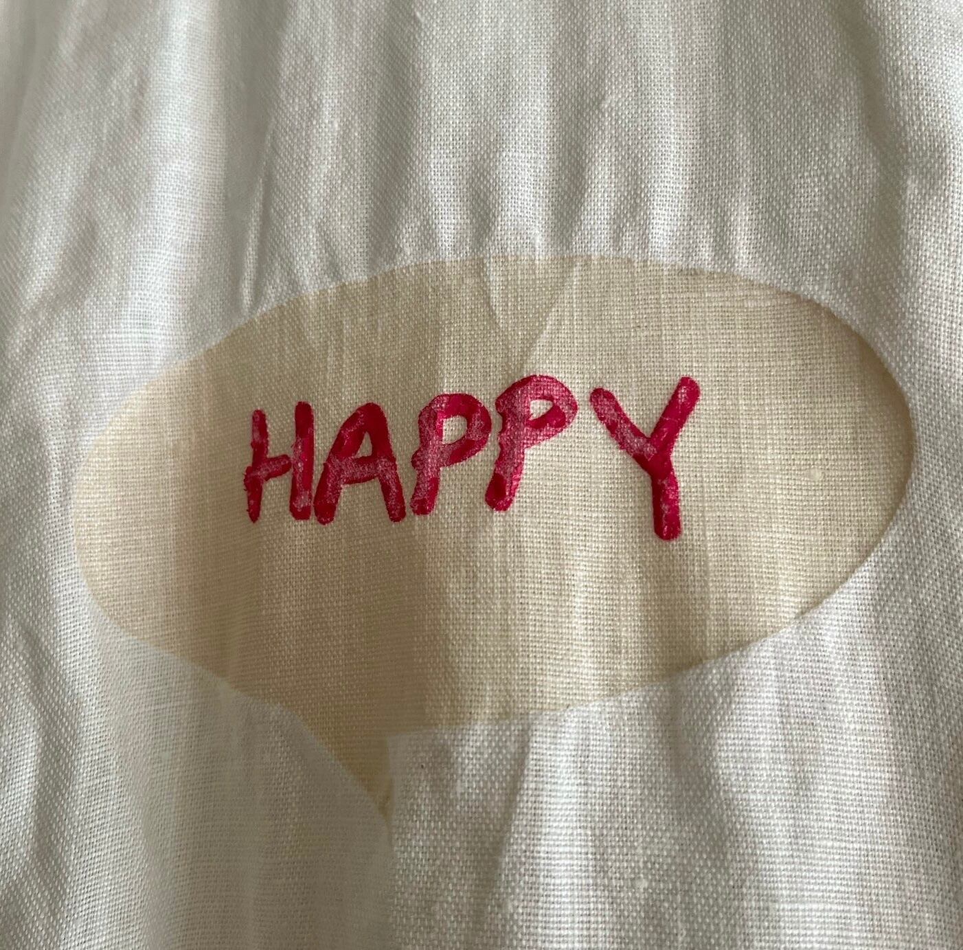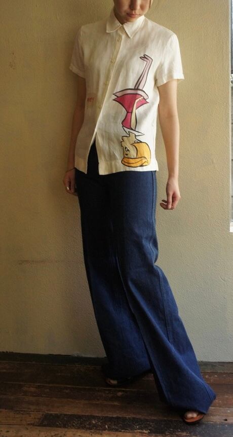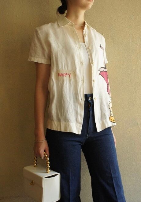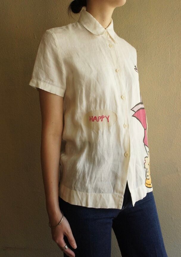 セリフのようなHAPPYのメッセージと逆さになった女性(60’s US tv: Jetsons)がとってもキュートなカステルバジャック vintage リネンシャツ、レア。