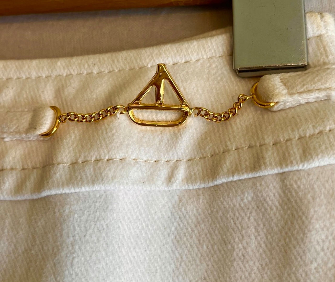 存在感のあるレッド×ブルーの組み合わせがcelineらしく、ウエストの船のゴールドチャームでキュートな印象に。。
