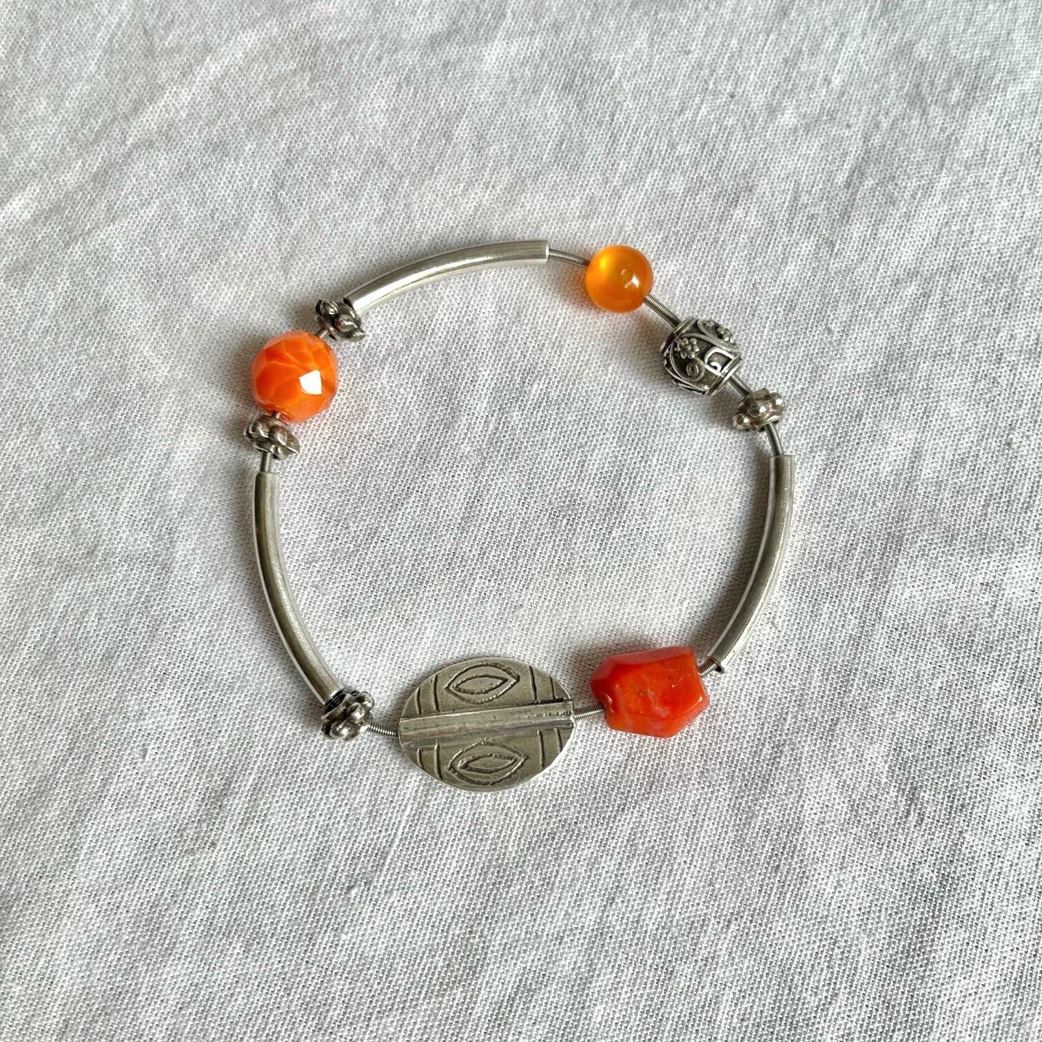 ガラスやプラスチックのユニークなカットのオレンジ色ビーズが、遊び心があり、とっても良いバランス!伝統的な細工とオレンジビーズを組み合わせた、エスニックな雰囲気が特徴です。